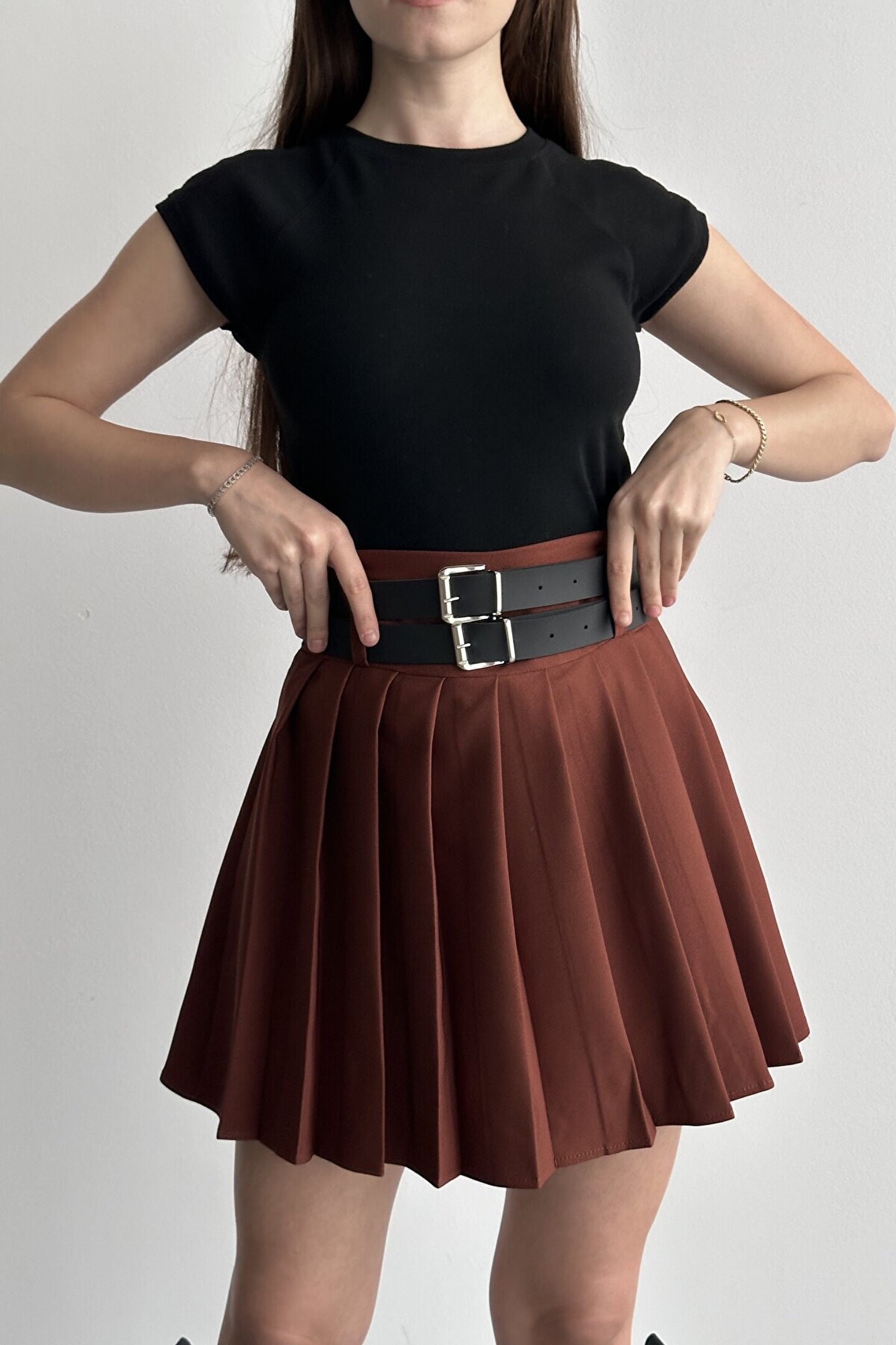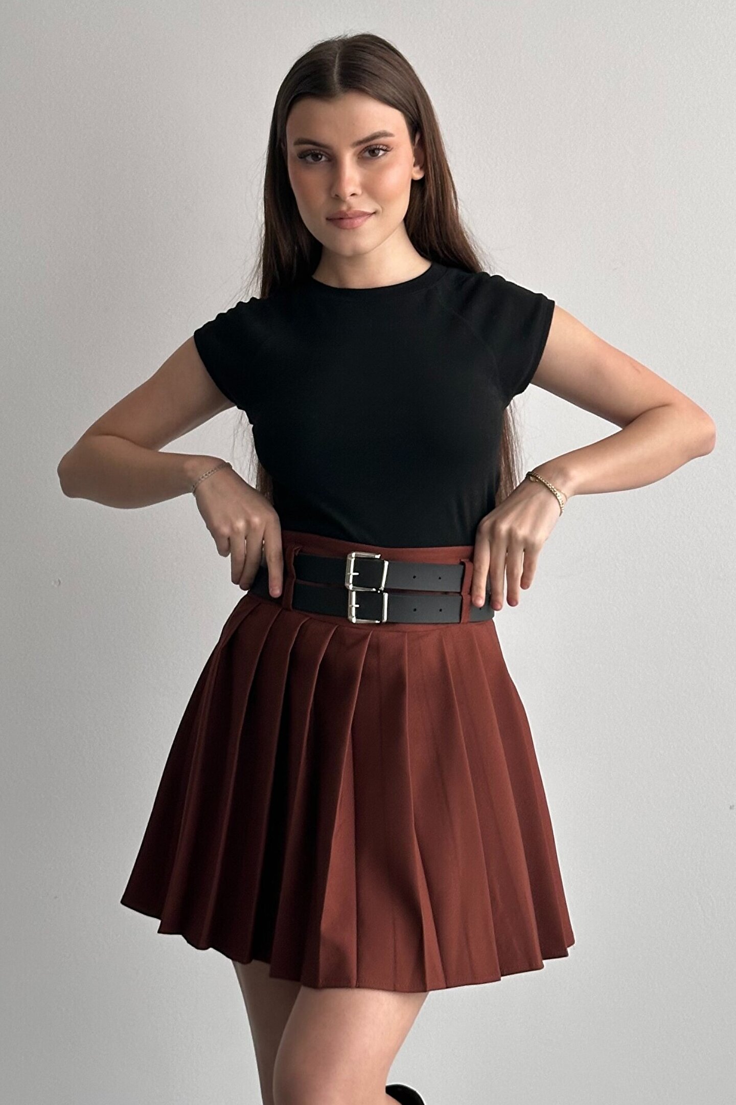 Çift kemer detayıyla öne çıkan yüksek bel pileli mini etek, günlük kombinlerin vazgeçilmez tamamlayıcı parçasıdır.; ; Modern ve güçlü stilin en iddialı parçalarından biri olan çift kemer detaylı pileli mini etek, günlük kombinlerden şehir stiline kadar birçok kullanım alanı sunar.; ; Yüksek bel tasarımı vücut formunu dengelerken pileli yapısı hareketli ve zarif bir görünüm kazandırır.; ; Bel kısmında yer alan çift kemer detayı ürüne karakter kazandırırken, kombinlerin odak noktası olmasını sağlar.; ; Günlük kullanımda basic tişört, crop, gömlek ve blazer ceketlerle rahatlıkla tamamlanabilir.; ; Akıcı formu sayesinde yürüyüş sırasında doğal hareket sağlar ve gün boyu konforlu kullanım sunar.; ; Hem spor hem şık kombinlere uyum sağlayabilen zamansız bir tasarımdır.; ; Yüksek bel form ; Çift kemer detay tasarım ; Pileli mini etek kesimi ; Günlük ve şehir stiline uygun ; Kombin tamamlayıcı modern görünüm ; Gardırobun kurtarıcı parçalarından biri olacak bu model, stiline güçlü ve dikkat çekici bir dokunuş katmak isteyen kadınlar için tasarlanmıştır.; ; Manken Ölçüleri: Boy:1.70cm Kilo:58kg (Üzerindeki ürün S bedendir);