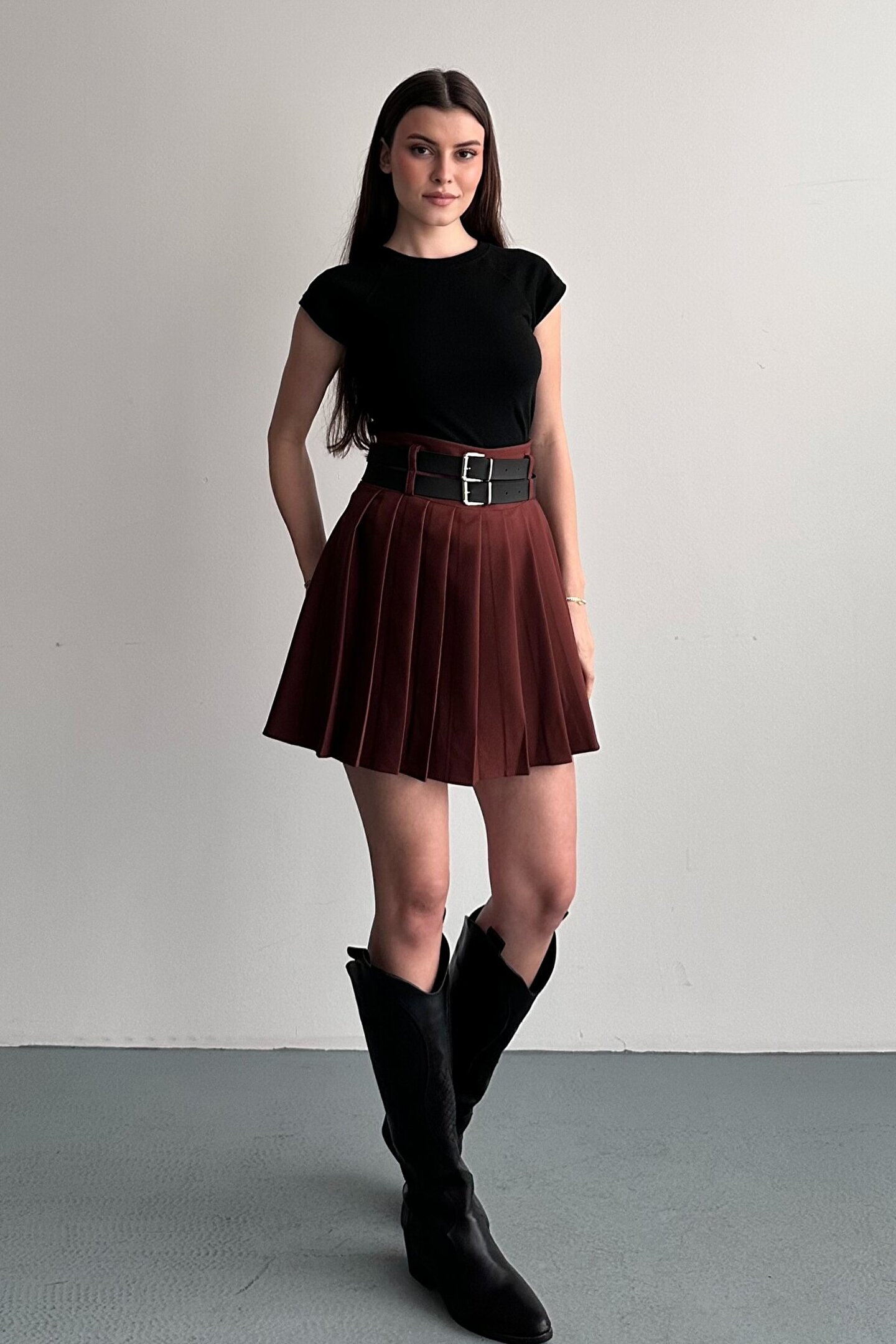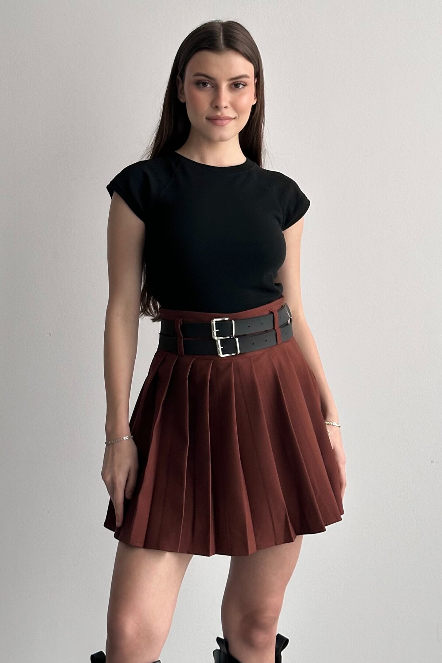 Çift kemer detayıyla öne çıkan yüksek bel pileli mini etek, günlük kombinlerin vazgeçilmez tamamlayıcı parçasıdır.; ; Modern ve güçlü stilin en iddialı parçalarından biri olan çift kemer detaylı pileli mini etek, günlük kombinlerden şehir stiline kadar birçok kullanım alanı sunar.; ; Yüksek bel tasarımı vücut formunu dengelerken pileli yapısı hareketli ve zarif bir görünüm kazandırır.; ; Bel kısmında yer alan çift kemer detayı ürüne karakter kazandırırken, kombinlerin odak noktası olmasını sağlar.; ; Günlük kullanımda basic tişört, crop, gömlek ve blazer ceketlerle rahatlıkla tamamlanabilir.; ; Akıcı formu sayesinde yürüyüş sırasında doğal hareket sağlar ve gün boyu konforlu kullanım sunar.; ; Hem spor hem şık kombinlere uyum sağlayabilen zamansız bir tasarımdır.; ; Yüksek bel form ; Çift kemer detay tasarım ; Pileli mini etek kesimi ; Günlük ve şehir stiline uygun ; Kombin tamamlayıcı modern görünüm ; Gardırobun kurtarıcı parçalarından biri olacak bu model, stiline güçlü ve dikkat çekici bir dokunuş katmak isteyen kadınlar için tasarlanmıştır.; ; Manken Ölçüleri: Boy:1.70cm Kilo:58kg (Üzerindeki ürün S bedendir);