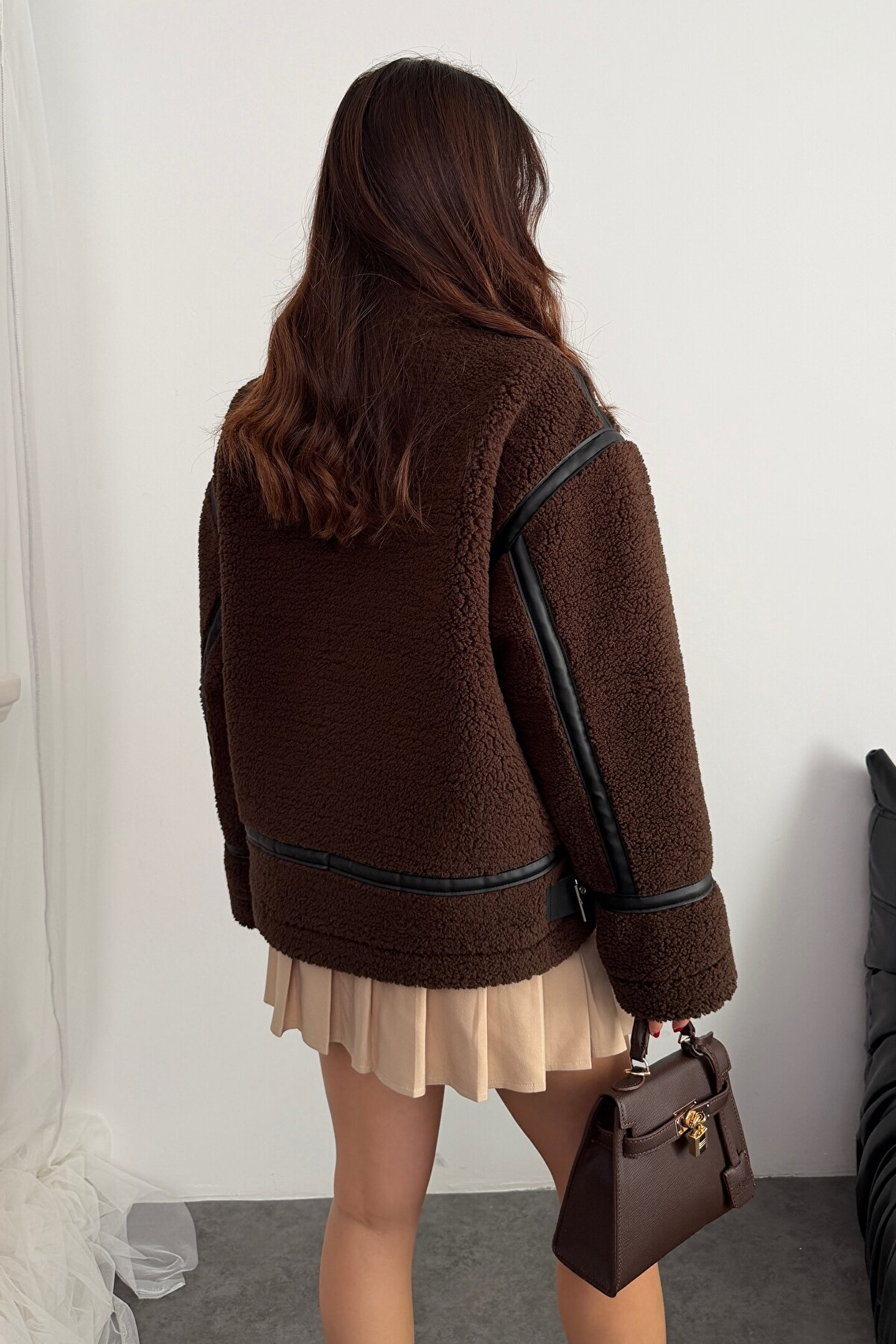moda armanc Kadın Deri Detaylı Oversize Peluş Mont - Premium Tasarım Biker Teddy Kaban Ceket