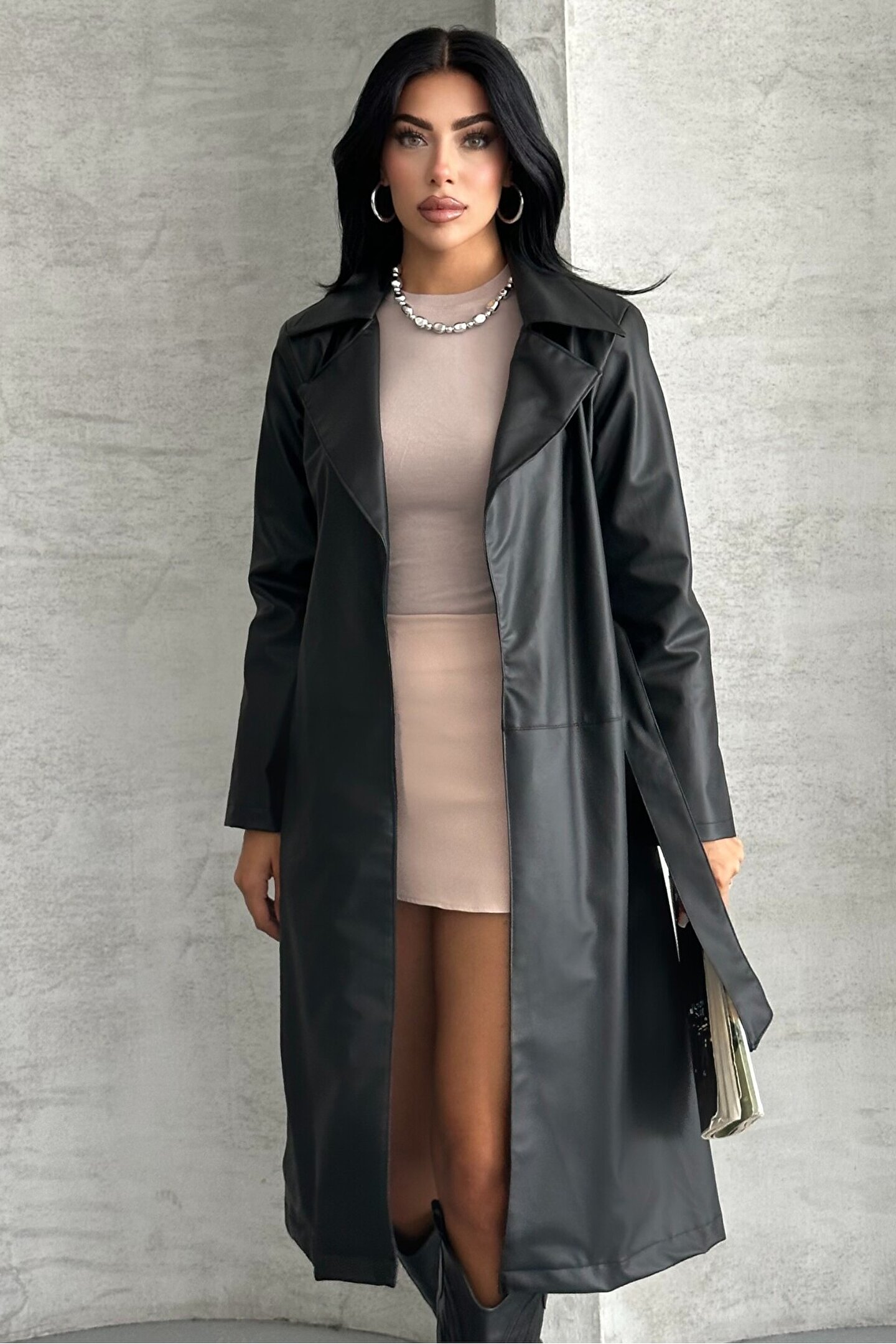 Şıklığı ve zarafeti bir arada sunan kadın deri trençkot modeli, gardırobunuzun vazgeçilmezi olacak.; ; Siyah ve bordo renk seçenekleriyle her kombine uyum sağlayan bu uzun deri trençkot, modern kesimi ve kuşaklı tasarımıyla stilinize sofistike bir hava katar.; ; Kuşaklı, belden ayarlanabilir tasarım ; Şık ve modern görünüm ; Yumuşak dokulu, kaliteli suni deri ; Mevsimlik kullanım için ideal ; Topuklu botlar, çizmeler veya sneakerlarla rahatlıkla kombinlenebilir ; İster günlük hayatta ister özel davetlerde şıklığınızı ön plana çıkarabilirsiniz.