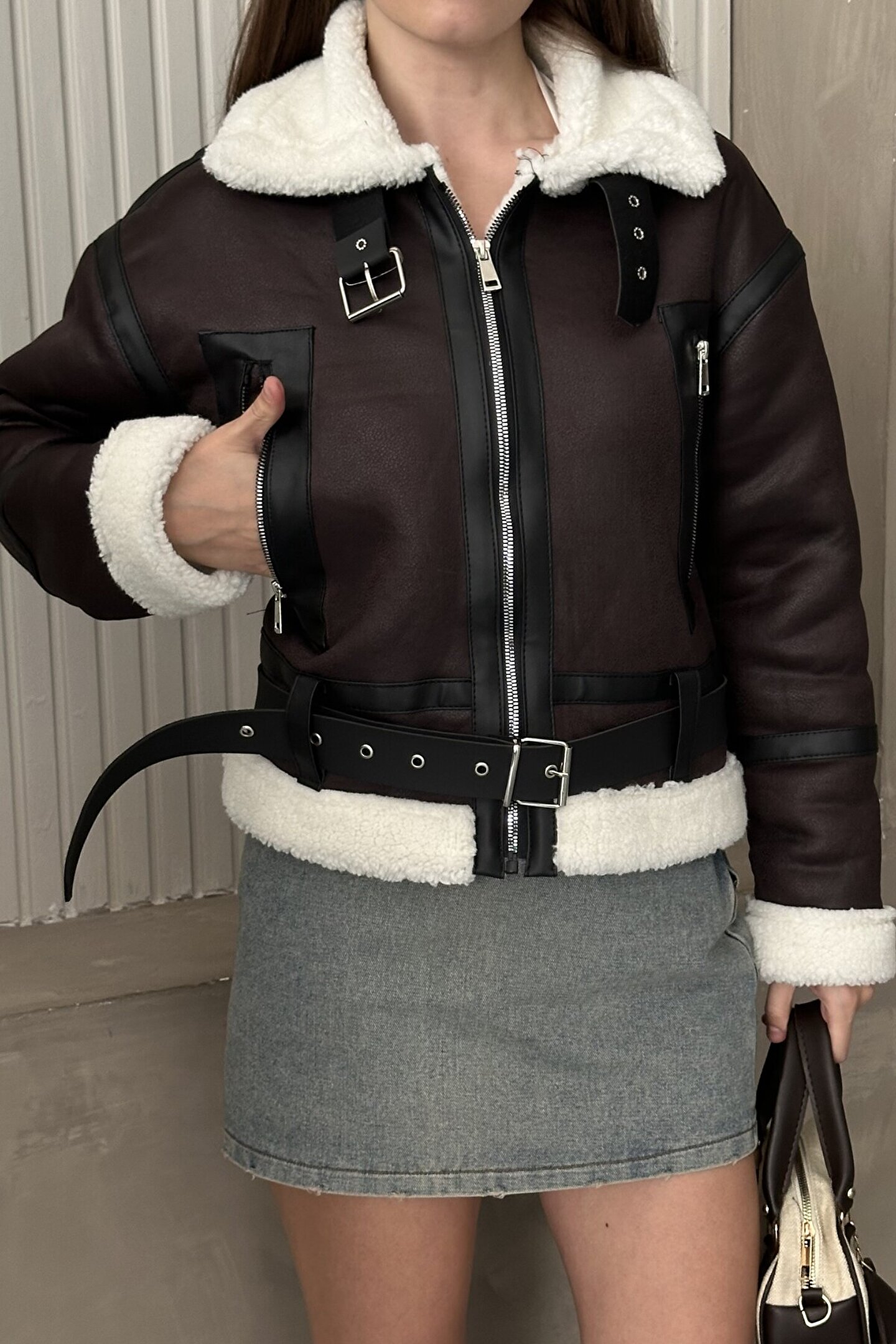 • Model: Kadın içi kürklü, kemerli aviator / biker deri mont