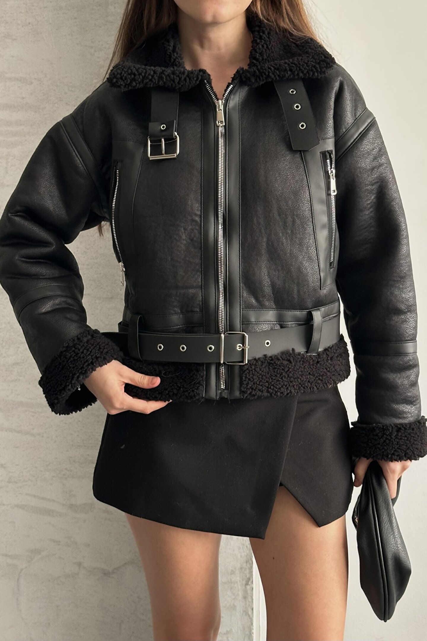 • Model: Kadın içi kürklü, kemerli aviator / biker deri mont