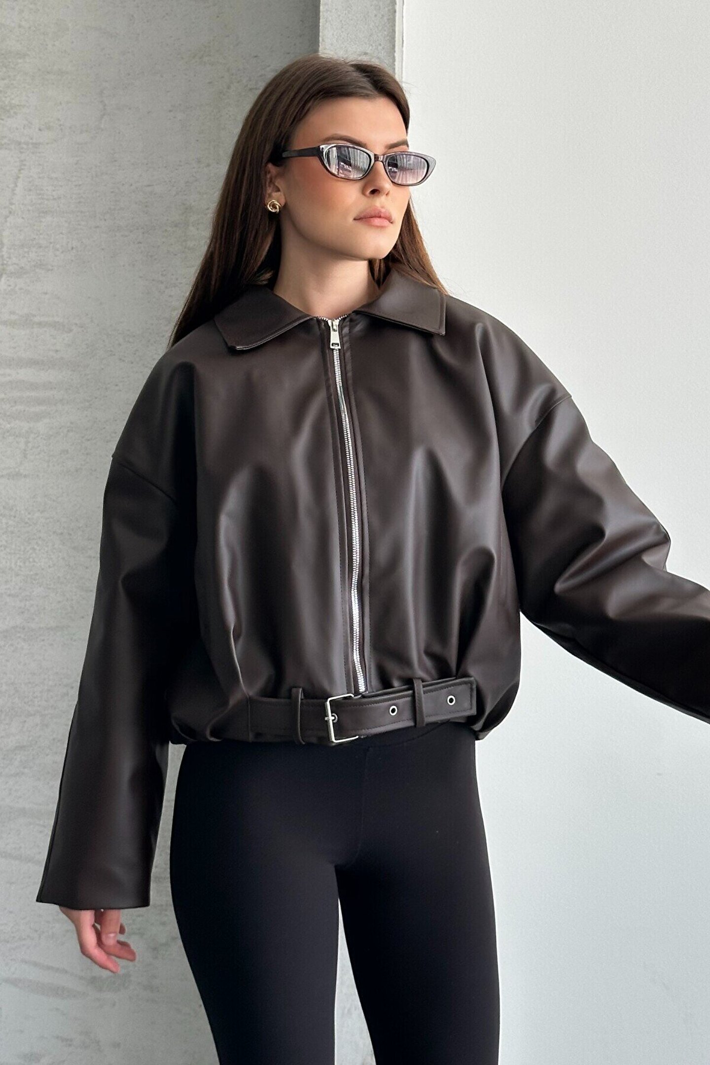 Kısa boy tasarımı sayesinde pantolon, tayt ve yüksek bel alt giyimlerle mükemmel uyum yakalayan bu kadın deri mont, fermuarlı yapısı ve kemer detayı ile stilinizi tamamlar.