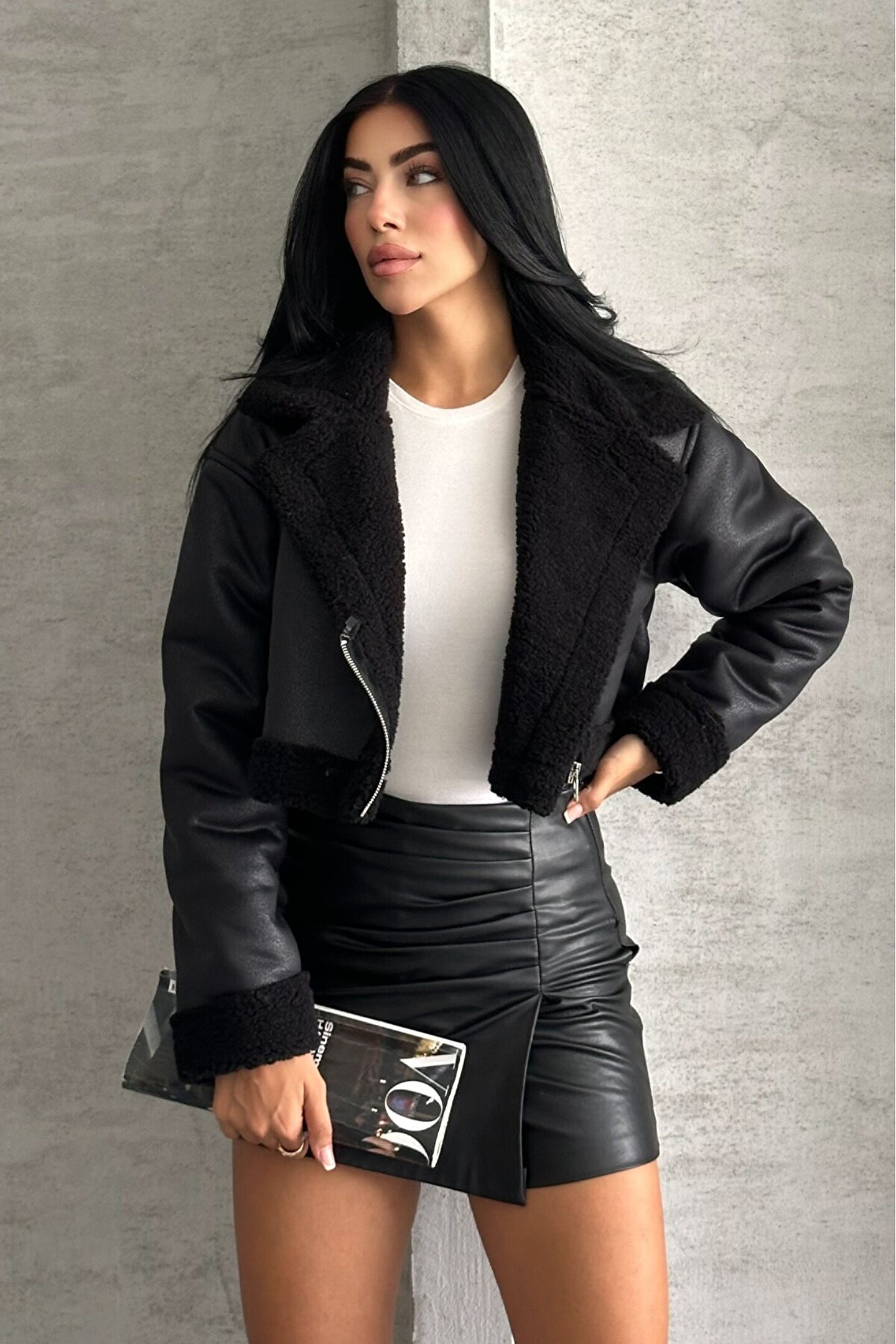 • Bu şık biker ceketi basic bir crop tişört ve uzun çizme ile kombinleyerek etkileyici bir görünüm yakalayabilirsiniz.