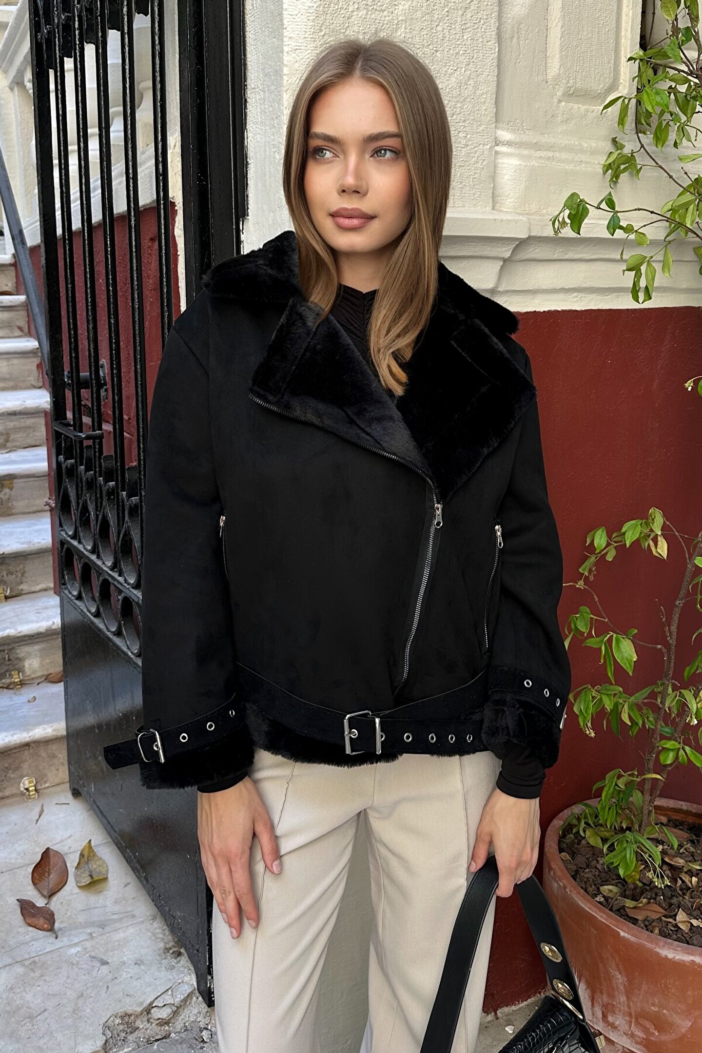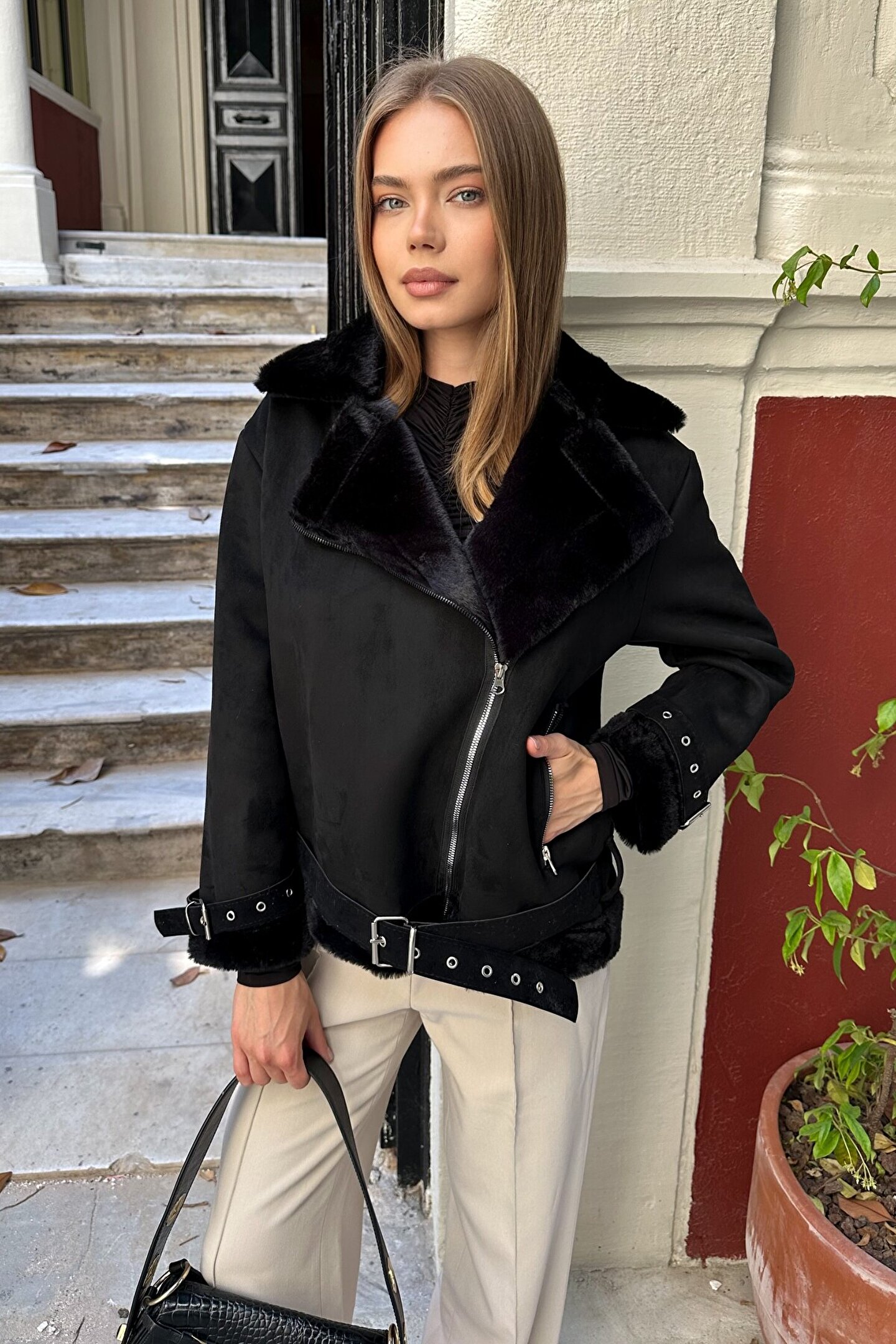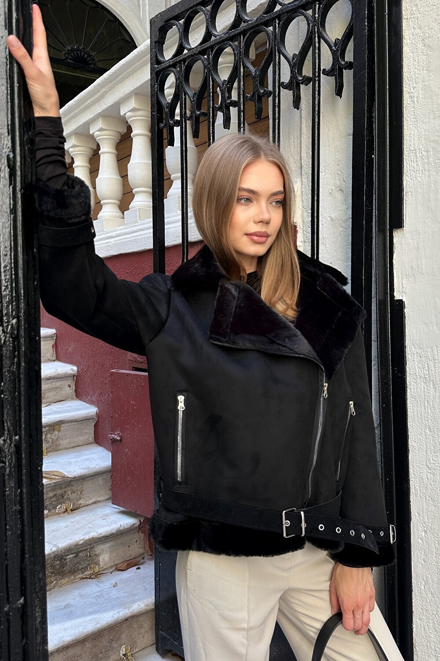 moda armanc Kadın Içi Rapitli Kemer Detaylı Süet Mont