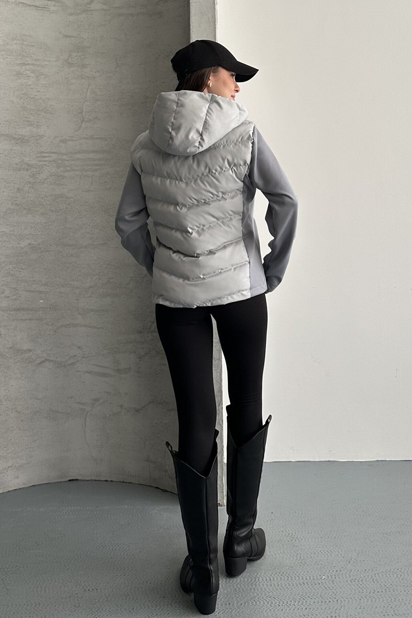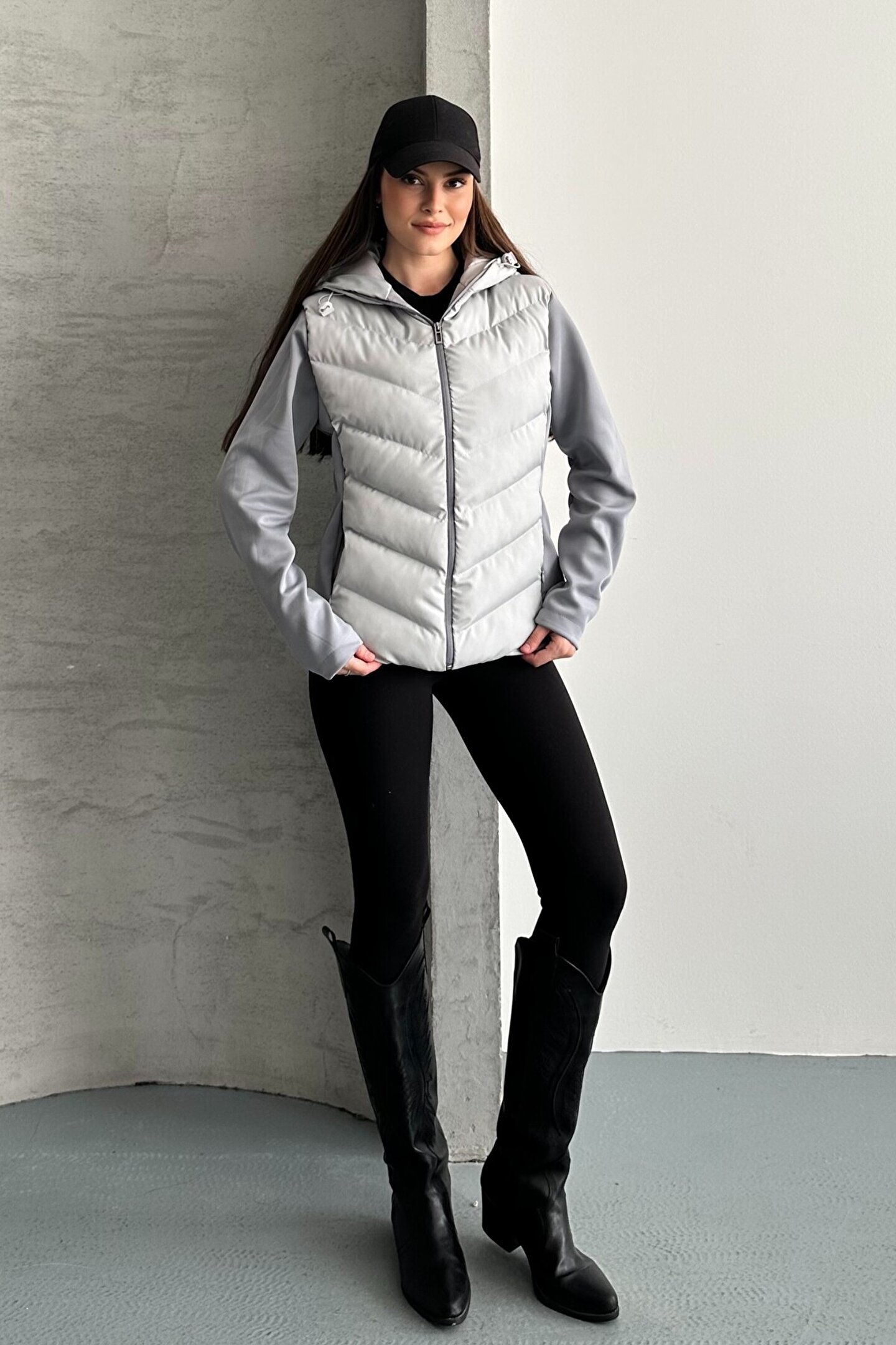 Kadın gri kapüşonlu şişme mont, minimal ve şehir stiline uyum sağlayan tasarımıyla sezonun en çok tercih edilen basic mont modelleri arasında yer alıyor.