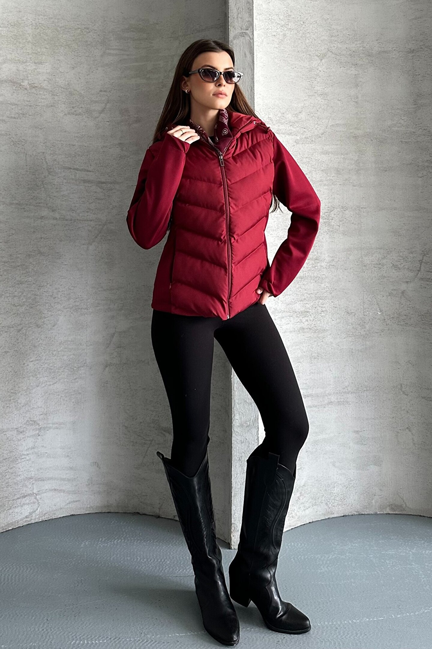 • Kadın bordo kapüşonlu şişme mont, şarap kırmızısının sofistike tonu ile günlük kombinlere iddialı ama zarif bir hava katar.