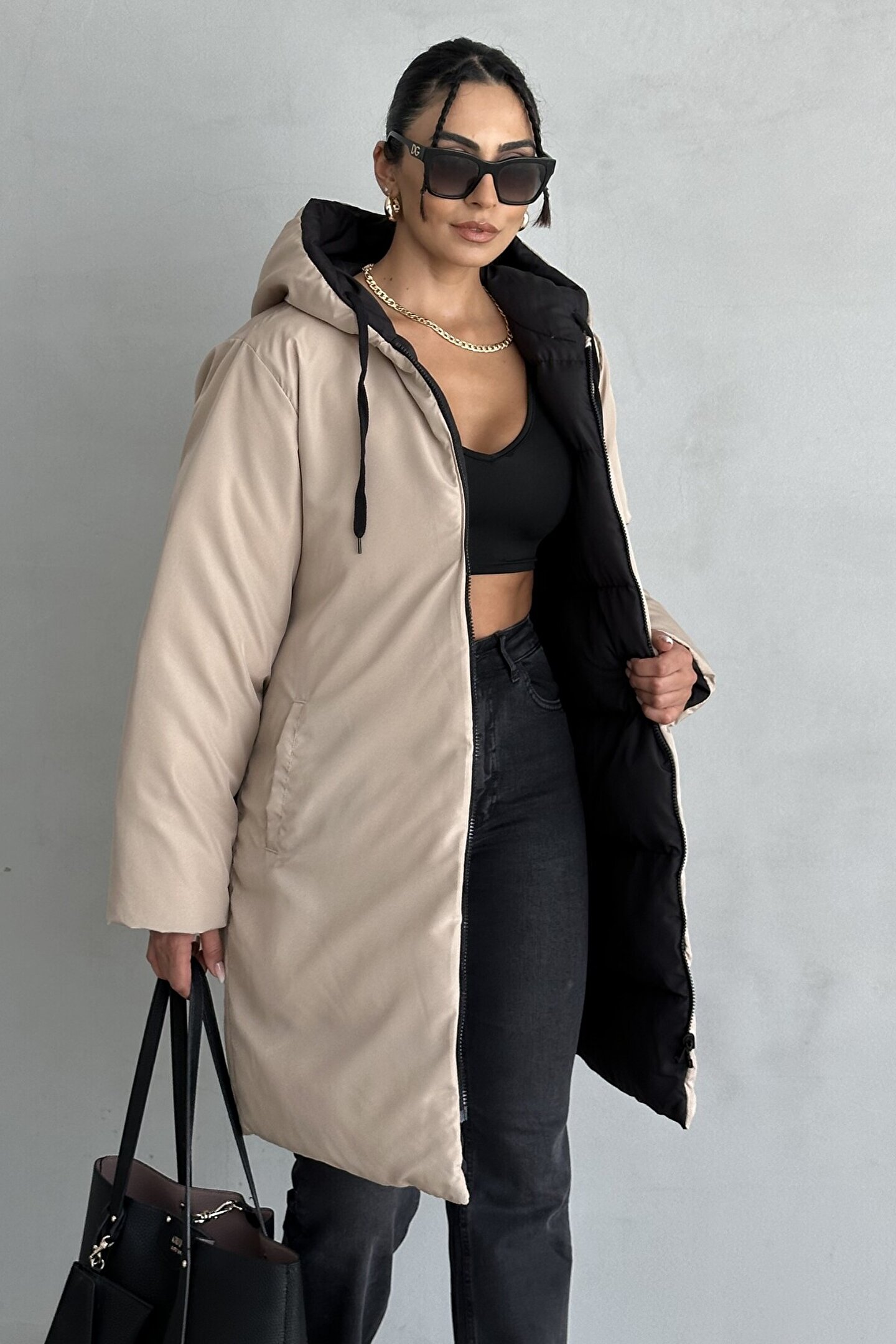 <li> Bir yüzü <b>bej</b>, diğer yüzü <b>siyah</b> olan mont sayesinde tek ürünle iki farklı stil yaratabilirsiniz.<br> </li>