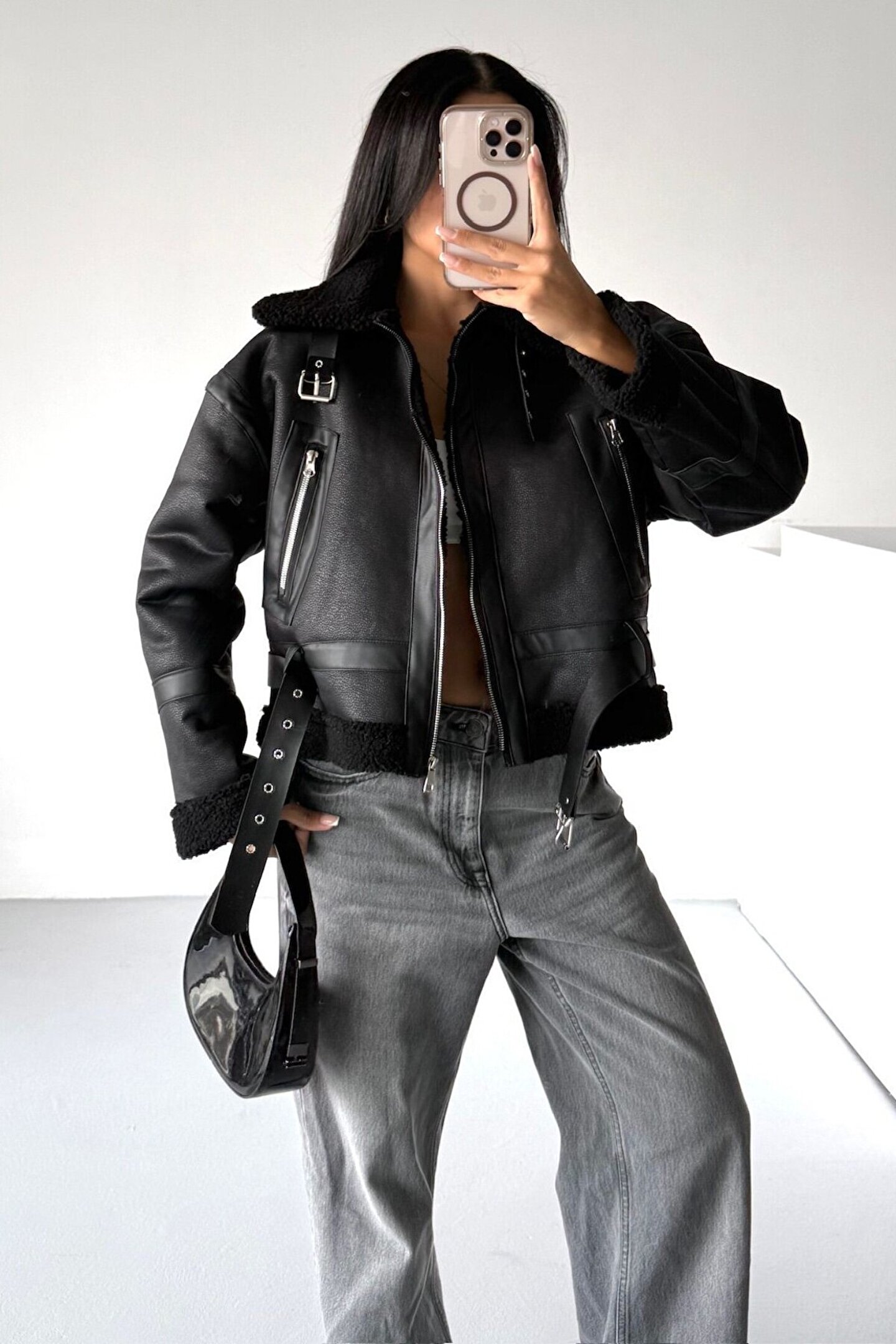 • Urban sokak stilinin en trend parçası: Kadın Siyah Kürk Astarlı Suni Deri Mont.