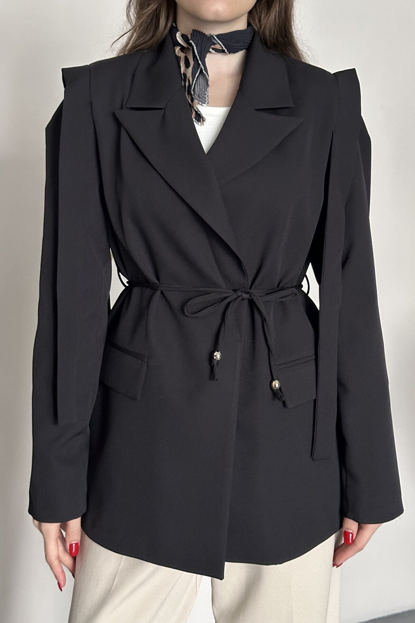 Belden bağlama detayı ve modern kesimiyle güçlü ve şık görünüm sunan zamansız blazer ceket modeli.; ; Modern silueti ve güçlü duruşuyla öne çıkan belden bağlamalı blazer ceket, klasik şıklığı çağdaş tasarım anlayışıyla buluşturur.; ; Uzun form kesimi ve dengeli kalıbı sayesinde hem günlük kombinlerde hem ofis stilinde rahatlıkla kullanılabilir.; ; Bel kısmındaki bağlama detayı vücut formunu zarif şekilde vurgularken, güçlü omuz yapısı daha dik ve modern bir görünüm kazandırır.; ; Minimal tasarımı sayesinde farklı kombinlere kolayca uyum sağlar.; ; Gömlek, crop, basic tişört ve kumaş pantolonlarla tamamlanarak şehir stilinden iş hayatına kadar geniş kullanım alanı sunar.; ; Gün boyu rahat kullanım sağlayan formu ile hem şık hem konforlu bir alternatif oluşturur.; ; Belden bağlamalı modern tasarım ; Güçlü omuz formu ; Uzun blazer kesimi ; Günlük ve ofis kullanımına uygun ; Kolay kombinlenebilir zamansız model ; Dengeli ve şık siluet görünümü ; Stilinde güçlü, modern ve dikkat çekici bir duruş isteyen kadınlar için tasarlanmıştır.; ;