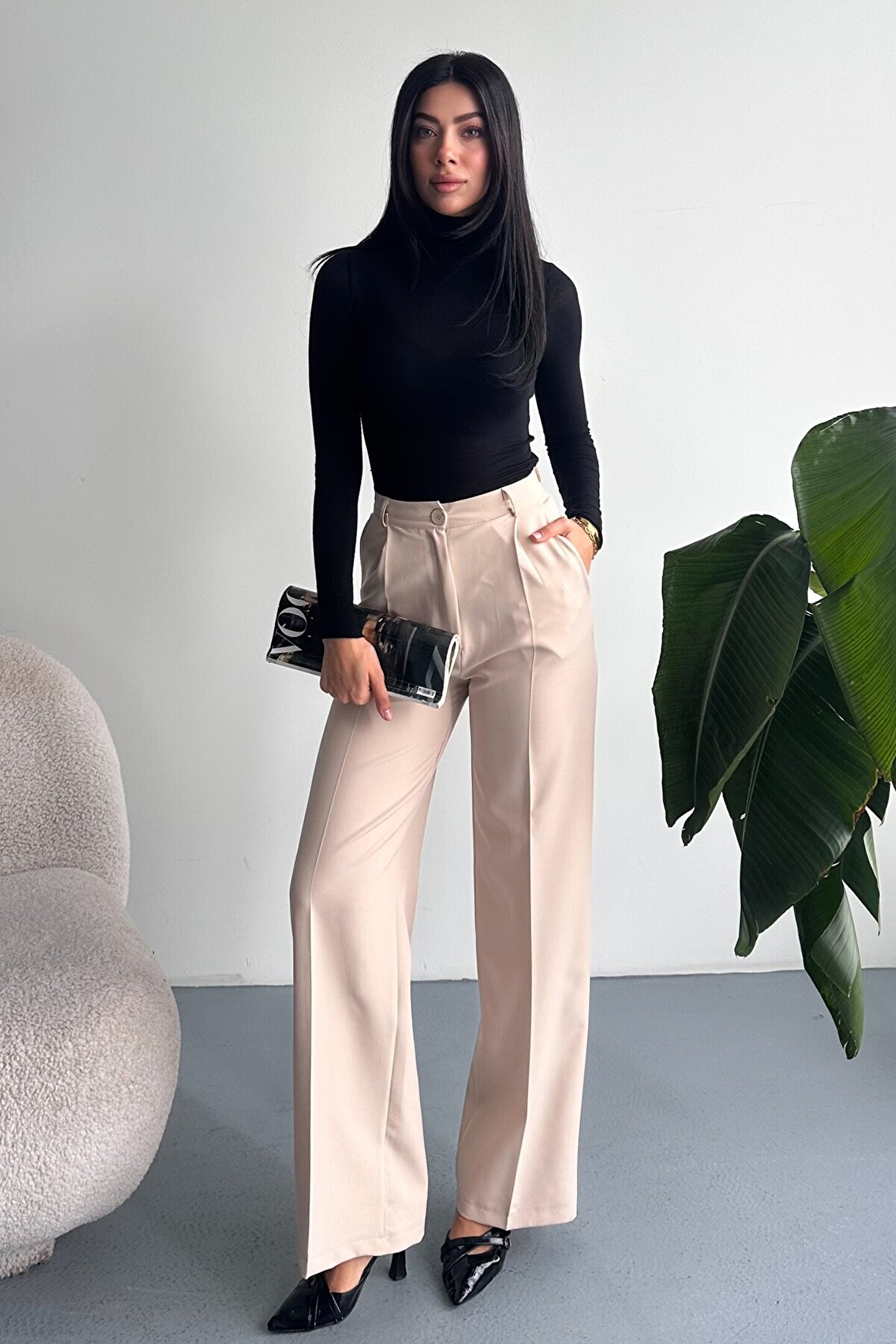 Kadın Palazzo Pantolon; Modern kesimi ve yüksek bel formuyla hem ofis hem günlük kombinlerin vazgeçilmez şık pantolon modeli.; ; Zamansız stil anlayışını modern kesimle buluşturan yüksek bel geniş paça kumaş pantolon, hem günlük kombinlerde hem ofis stilinde şık ve güçlü bir görünüm sunar.; ; Yüksek bel tasarımı vücut formunu dengelerken, akıcı ve düz paça kesimi bacak boyunu daha uzun ve zarif gösterir.; ; Minimal ve sade görünümü sayesinde farklı üst parçalarla kolayca kombinlenebilir.; ; Günlük kullanımda crop, basic tişört ve gömleklerle modern bir stil oluştururken, blazer ve topuklu ayakkabı ile klasik ofis şıklığına uyum sağlar.; ; Akıcı yapısı gün boyu konfor sunarken, güçlü silueti sayesinde stil sahibi ve modern bir duruş kazandırır.; ; Yüksek bel toparlayıcı form ; İspanyol paça modern kesim ; Akıcı ve rahat kumaş yapısı ; Günlük, ofis ve şehir stiline uygun ; Kolay kombinlenebilir zamansız tasarım ; Şık ve dengeli siluet görünümü ; Gardırobun en kurtarıcı parçalarından biri olacak bu model, hem klasik hem modern stil seven kadınlar için tasarlanmıştır.; ;