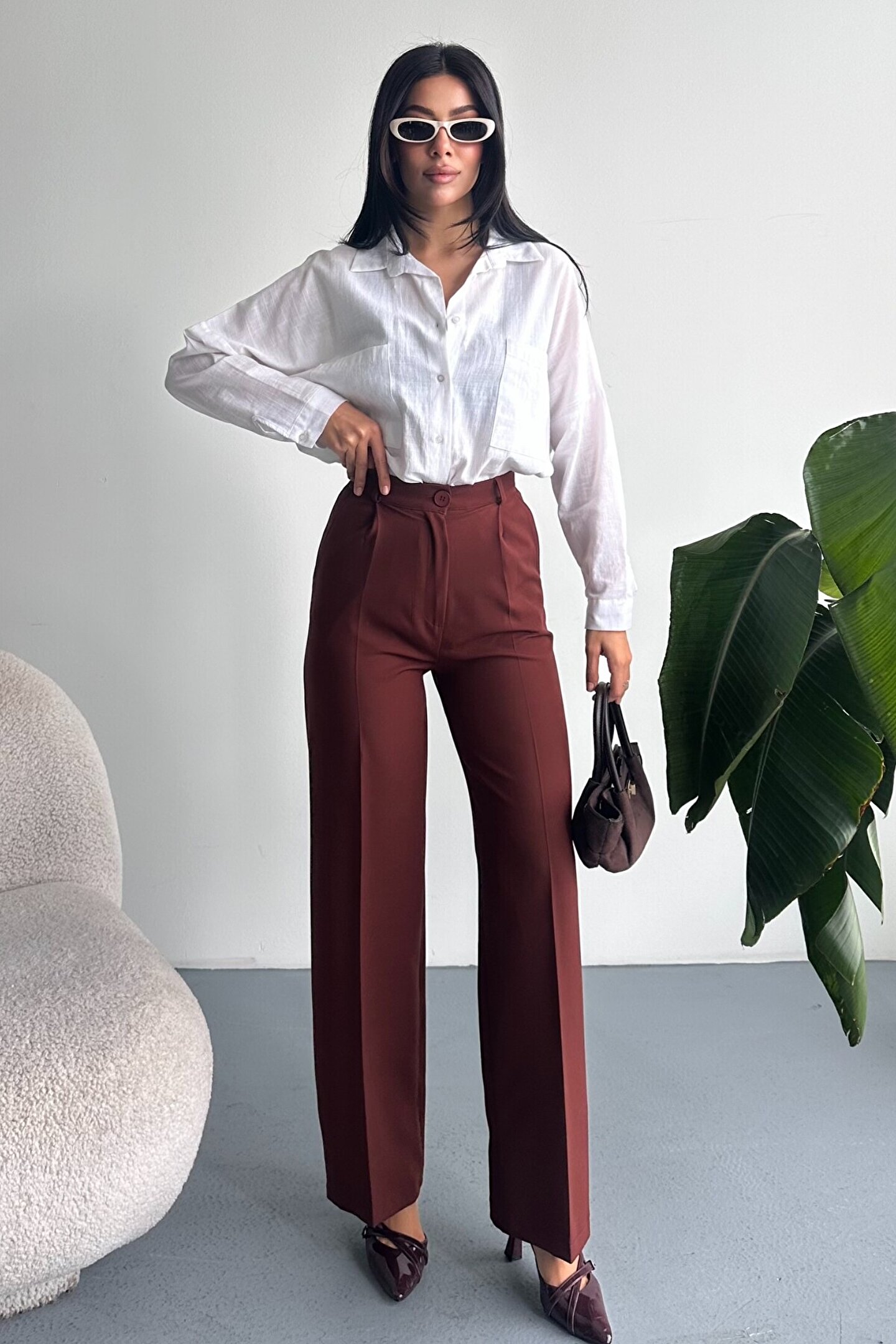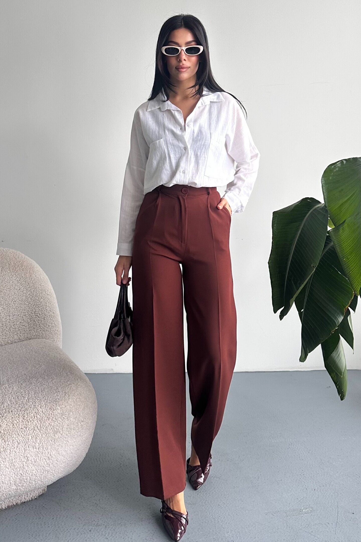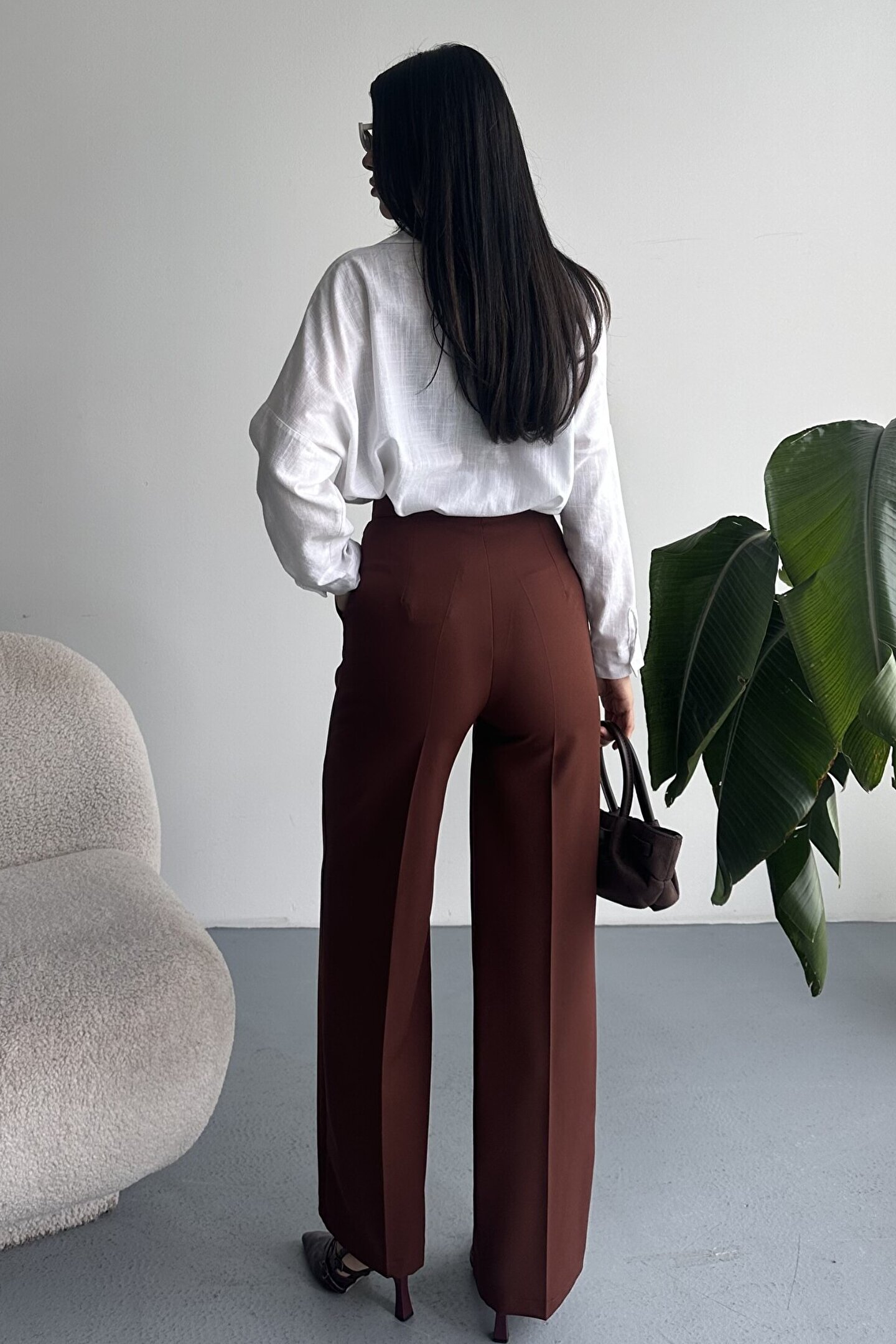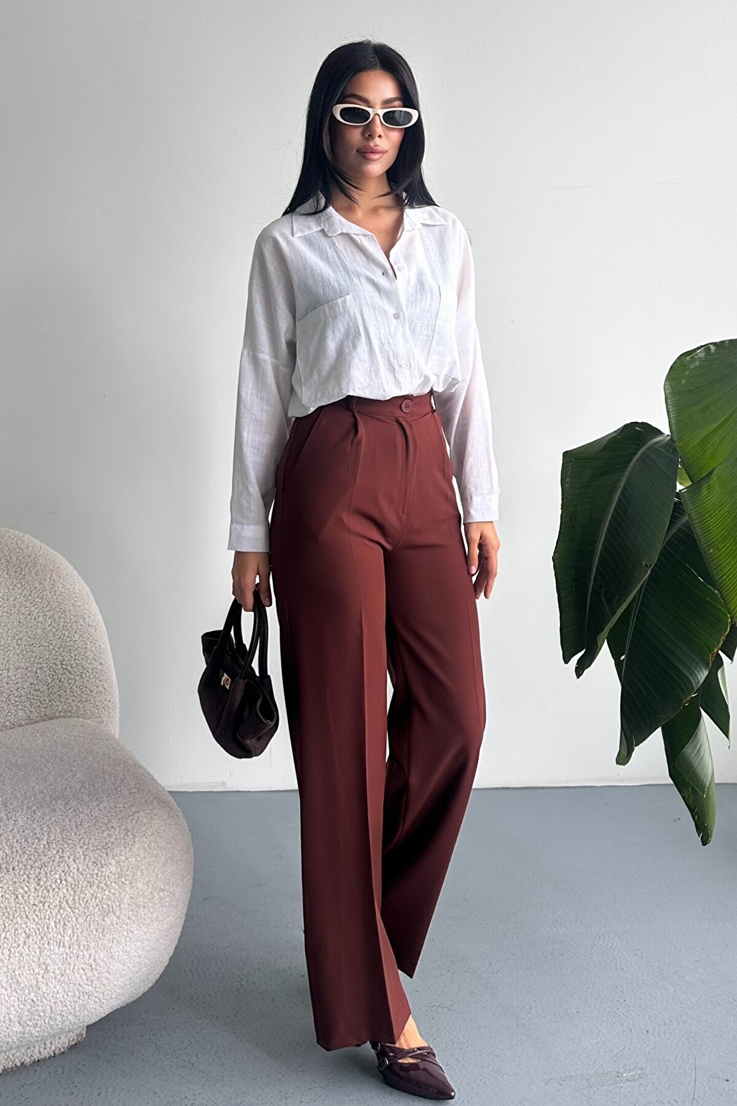 Kadın Palazzo Pantolon; Modern kesimi ve yüksek bel formuyla hem ofis hem günlük kombinlerin vazgeçilmez şık pantolon modeli.; ; Zamansız stil anlayışını modern kesimle buluşturan yüksek bel geniş paça kumaş pantolon, hem günlük kombinlerde hem ofis stilinde şık ve güçlü bir görünüm sunar.; ; Yüksek bel tasarımı vücut formunu dengelerken, akıcı ve düz paça kesimi bacak boyunu daha uzun ve zarif gösterir.; ; Minimal ve sade görünümü sayesinde farklı üst parçalarla kolayca kombinlenebilir.; ; Günlük kullanımda crop, basic tişört ve gömleklerle modern bir stil oluştururken, blazer ve topuklu ayakkabı ile klasik ofis şıklığına uyum sağlar.; ; Akıcı yapısı gün boyu konfor sunarken, güçlü silueti sayesinde stil sahibi ve modern bir duruş kazandırır.; ; Yüksek bel toparlayıcı form ; İspanyol paça modern kesim ; Akıcı ve rahat kumaş yapısı ; Günlük, ofis ve şehir stiline uygun ; Kolay kombinlenebilir zamansız tasarım ; Şık ve dengeli siluet görünümü ; Gardırobun en kurtarıcı parçalarından biri olacak bu model, hem klasik hem modern stil seven kadınlar için tasarlanmıştır.; ;
