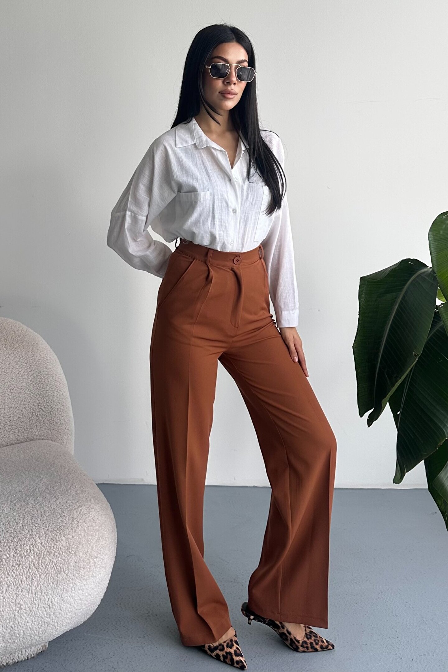 Kadın Palazzo Pantolon; Modern kesimi ve yüksek bel formuyla hem ofis hem günlük kombinlerin vazgeçilmez şık pantolon modeli.; ; Zamansız stil anlayışını modern kesimle buluşturan yüksek bel geniş paça kumaş pantolon, hem günlük kombinlerde hem ofis stilinde şık ve güçlü bir görünüm sunar.; ; Yüksek bel tasarımı vücut formunu dengelerken, akıcı ve düz paça kesimi bacak boyunu daha uzun ve zarif gösterir.; ; Minimal ve sade görünümü sayesinde farklı üst parçalarla kolayca kombinlenebilir.; ; Günlük kullanımda crop, basic tişört ve gömleklerle modern bir stil oluştururken, blazer ve topuklu ayakkabı ile klasik ofis şıklığına uyum sağlar.; ; Akıcı yapısı gün boyu konfor sunarken, güçlü silueti sayesinde stil sahibi ve modern bir duruş kazandırır.; ; Yüksek bel toparlayıcı form ; İspanyol paça modern kesim ; Akıcı ve rahat kumaş yapısı ; Günlük, ofis ve şehir stiline uygun ; Kolay kombinlenebilir zamansız tasarım ; Şık ve dengeli siluet görünümü ; Gardırobun en kurtarıcı parçalarından biri olacak bu model, hem klasik hem modern stil seven kadınlar için tasarlanmıştır.; ;