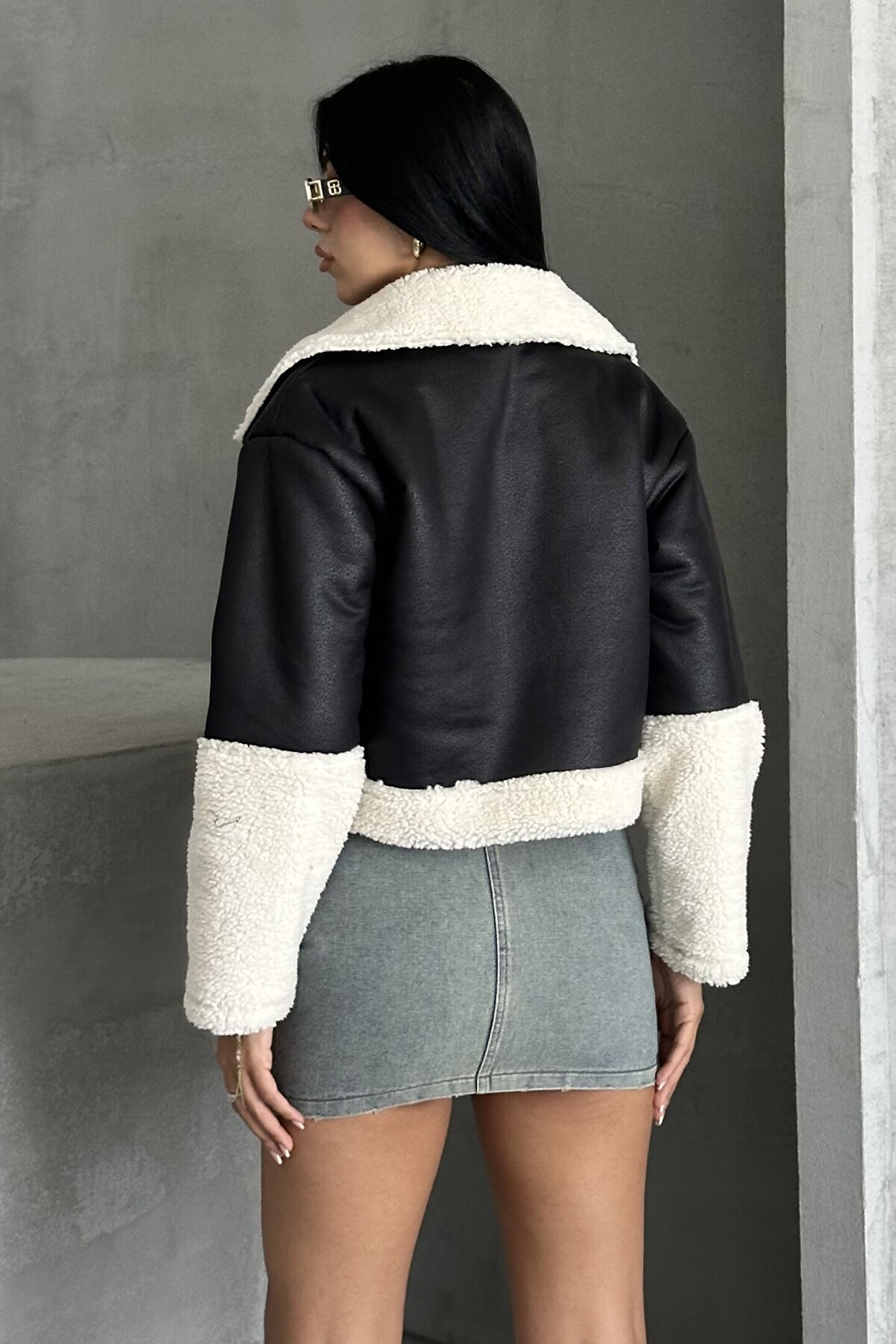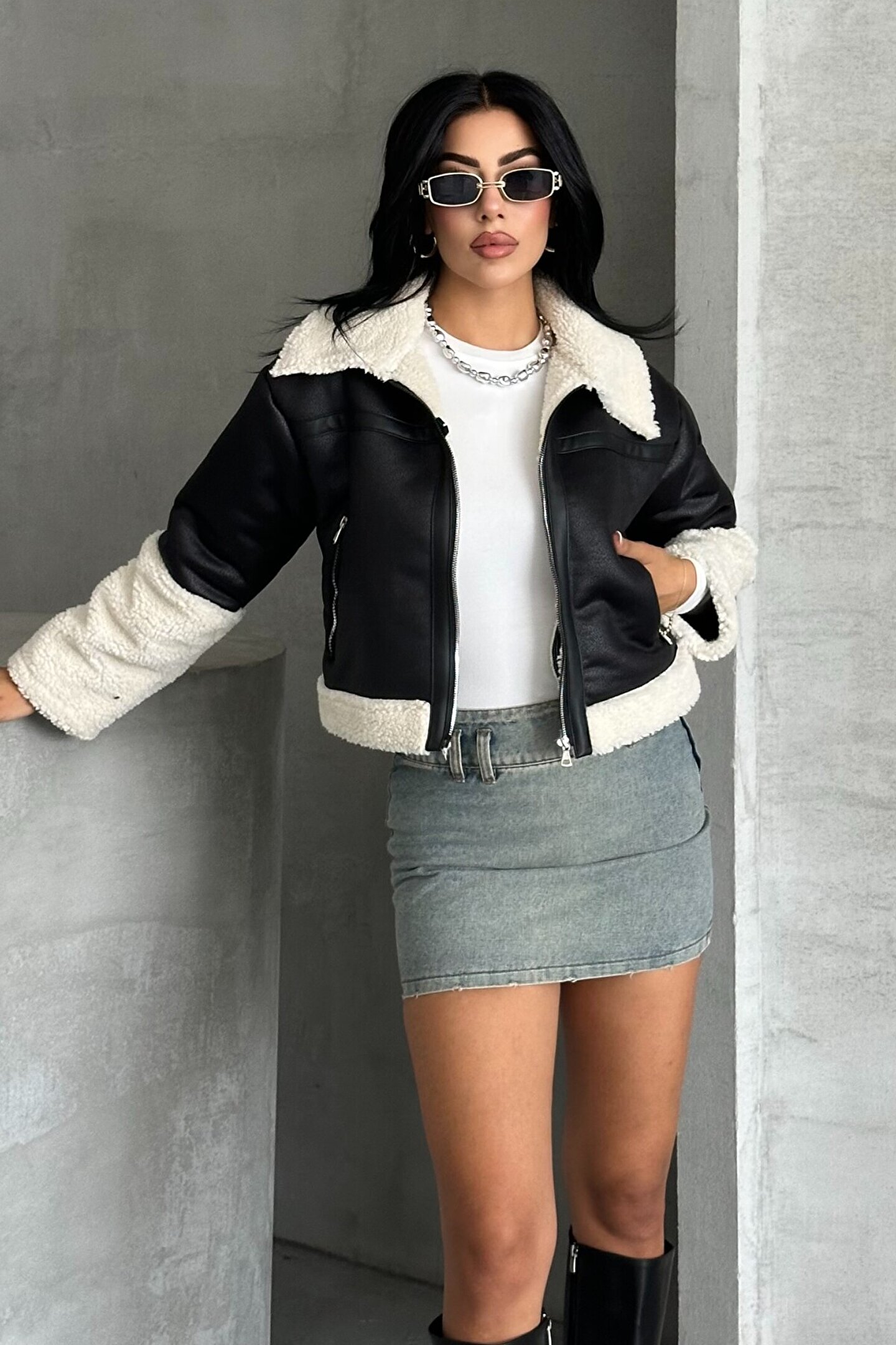 moda armanc Kadın Peluş Detaylı Crop Biker Suni Deri Mont
