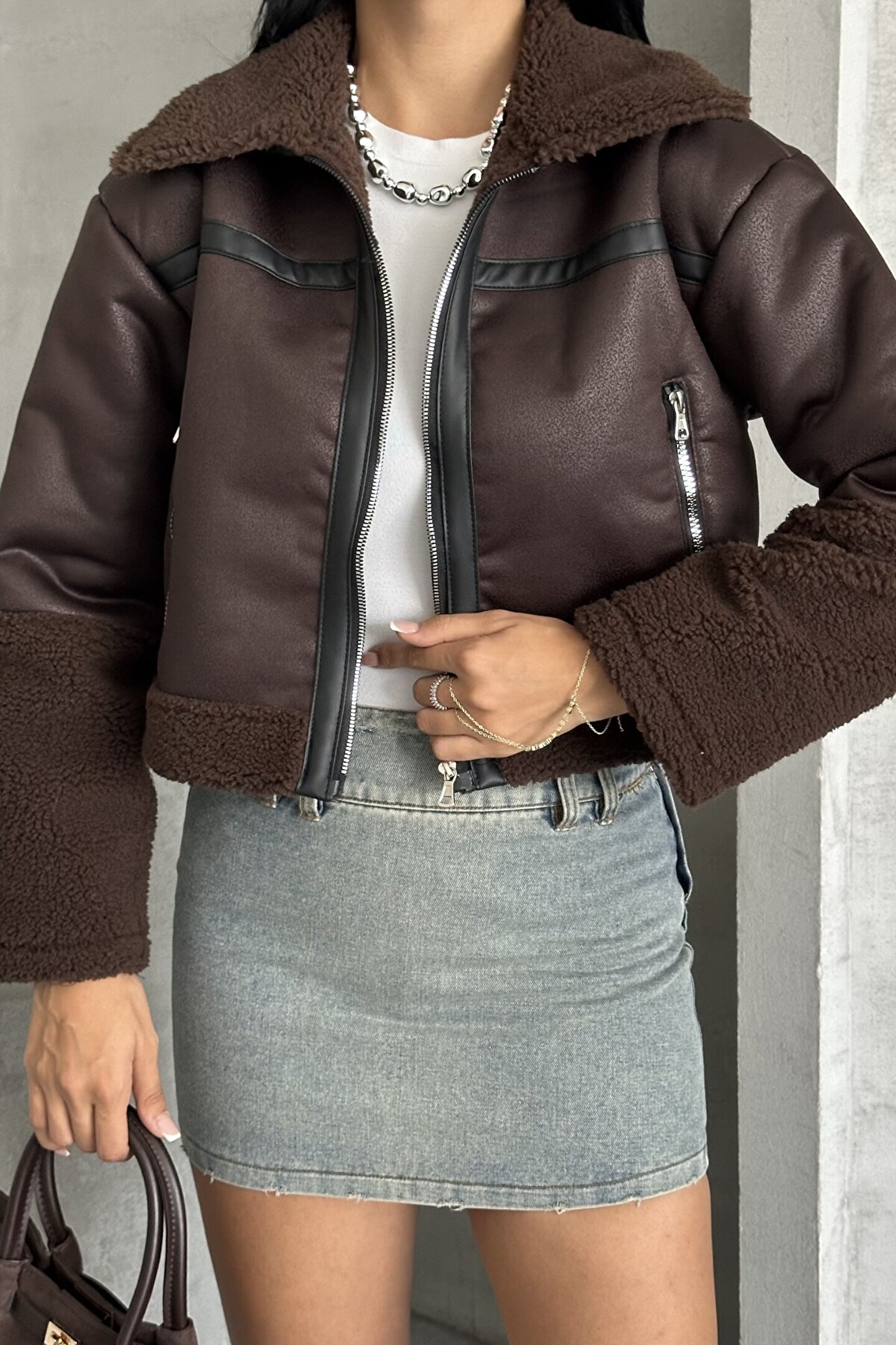 Yeni sezonun favorisi olmaya aday bu kadın crop mont, kürk detaylı yapısıyla soğuk havalarda hem şıklığı hem sıcaklığı bir arada sunar.; ; Deri görünümlü yüzeyi ve bomber kesimi ile sokak modasına modern bir dokunuş katarken, iç kısmındaki yumuşak kürk astarı konforu üst seviyeye taşır.; ; Fermuarlı yapısı sayesinde kolay kullanım sağlar, cepli tasarımıyla hem pratik hem stil sahibi bir görünüm sunar.; ; Şişme formu ile oversize mont trendine uygun olan bu model, ister jean pantolon ister mini etek ile kolayca kombinlenebilir.; ; Günlük kullanımda, okulda, sokakta veya şehir gezilerinde tarzınızı yansıtmak için ideal bir seçim.; ; Crop kesim modern duruş; Deri görünümlü dış yüzey; Fermuarlı ve cepli kullanım; Peluş astarlı iç yapı; Sezonun en trend kadın dış giyim modellerinden;