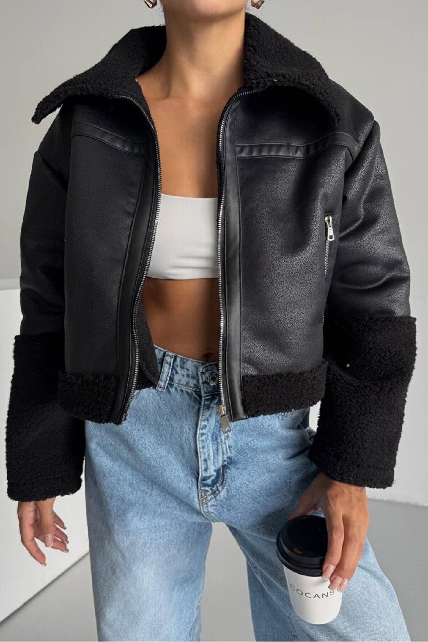 moda armanc Kadın Peluş Detaylı Crop Biker Suni Deri Mont