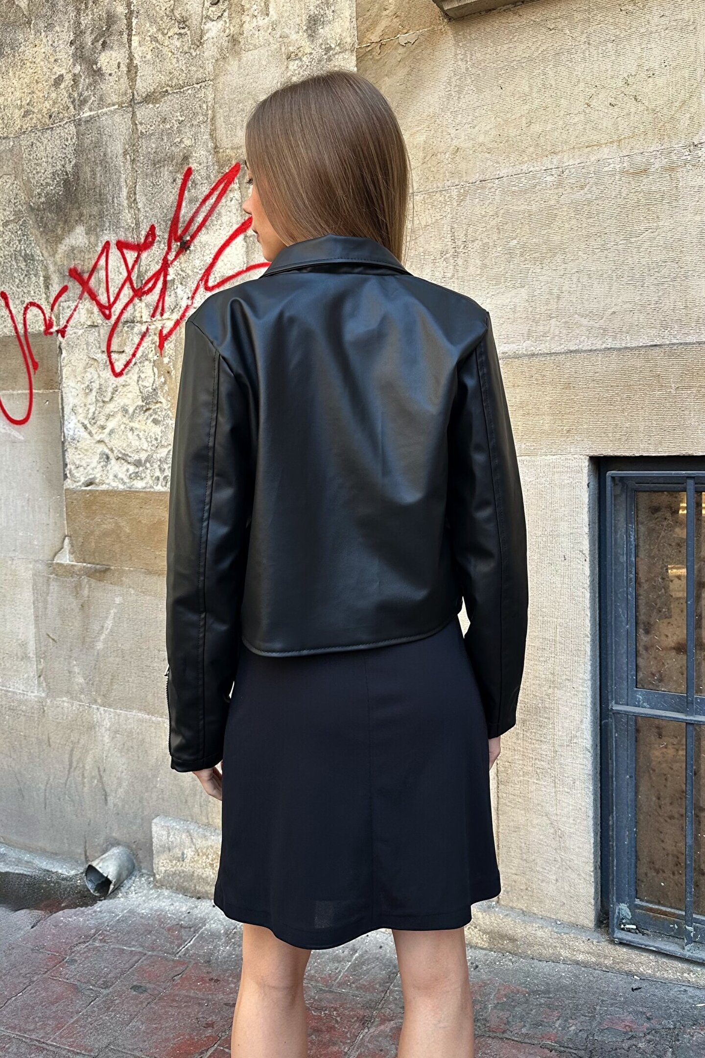moda armanc Kadın Siyah Crop Suni Deri Ceket - Fermuar ve Bağcık Detaylı Biker Style