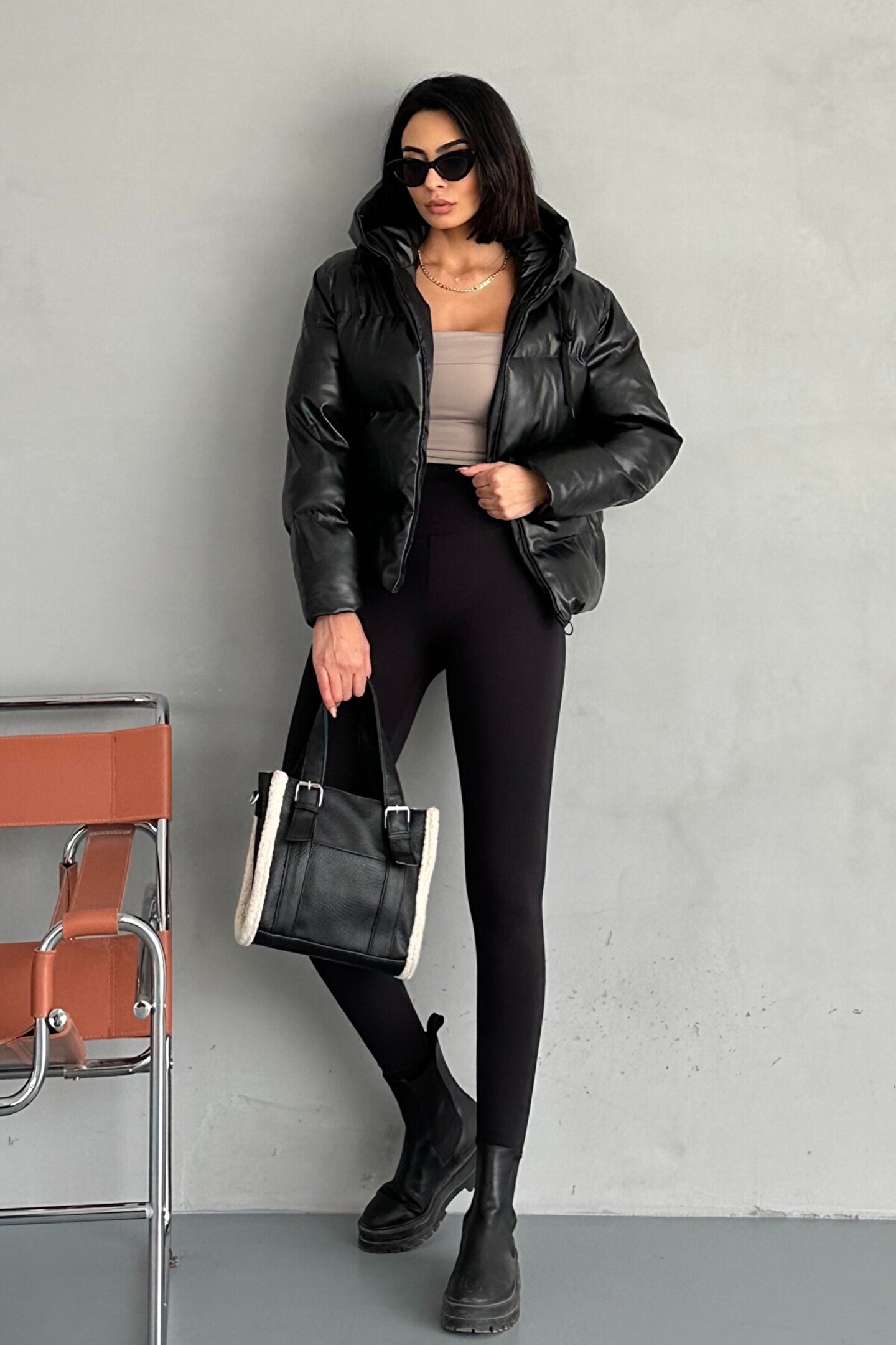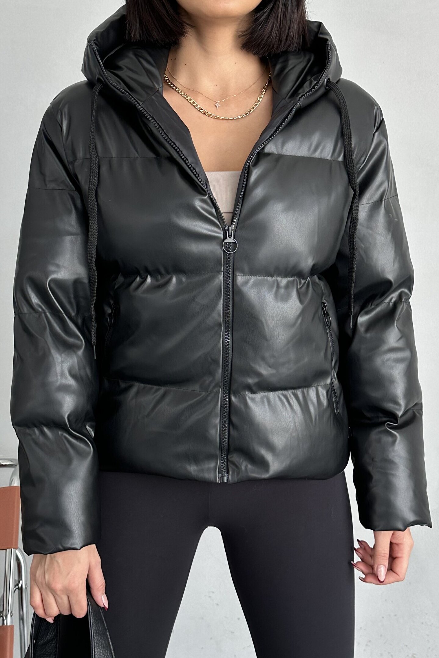 moda armanc Kadın Siyah Deri Kapüşonlu Şişme Mont - Oversize