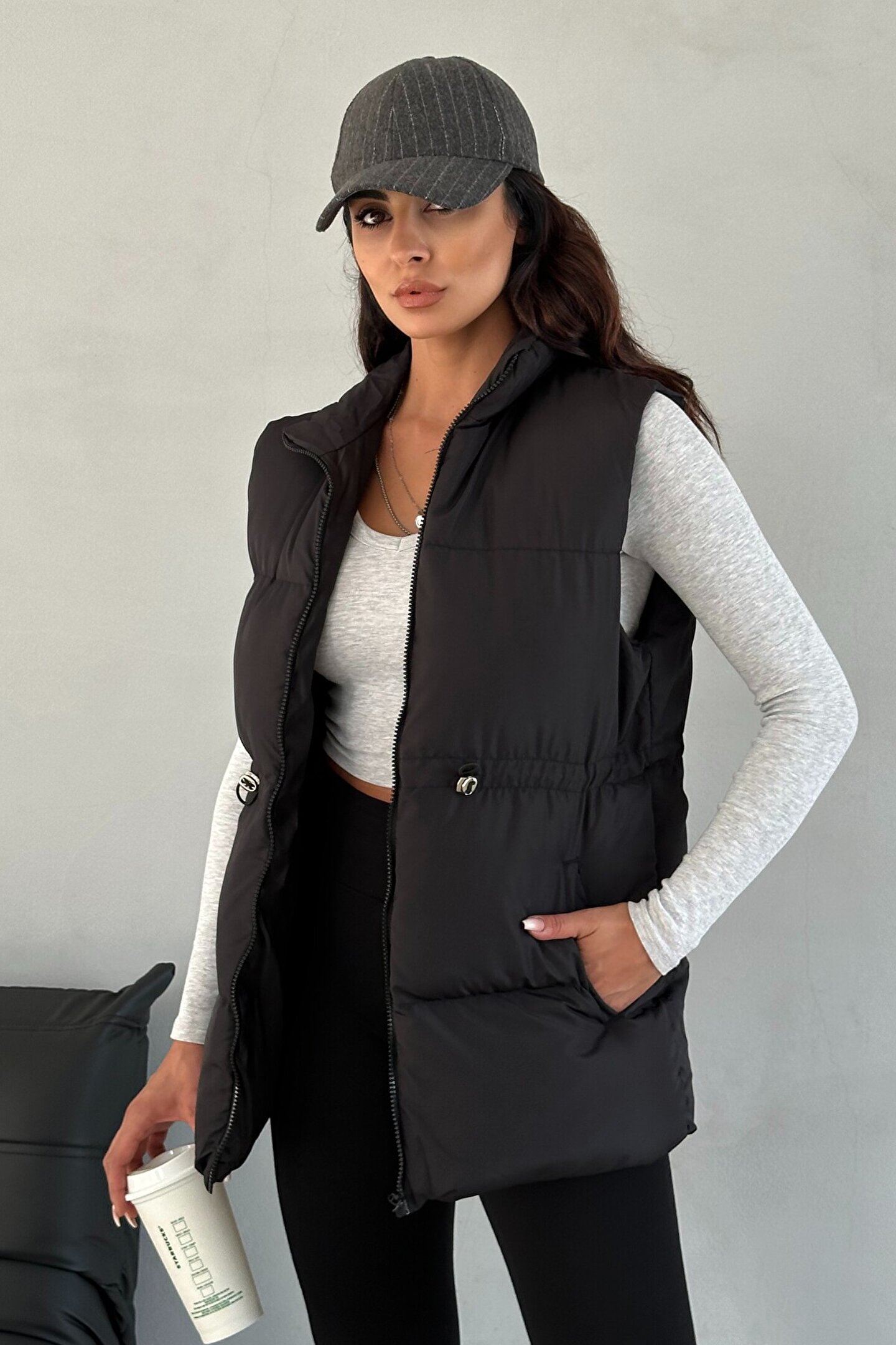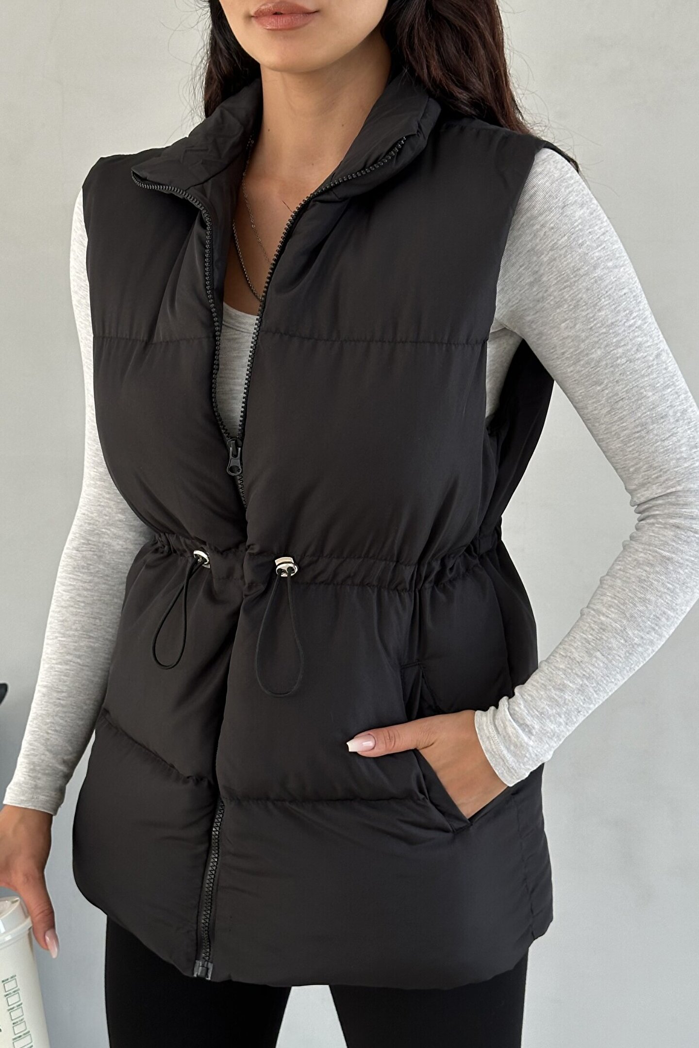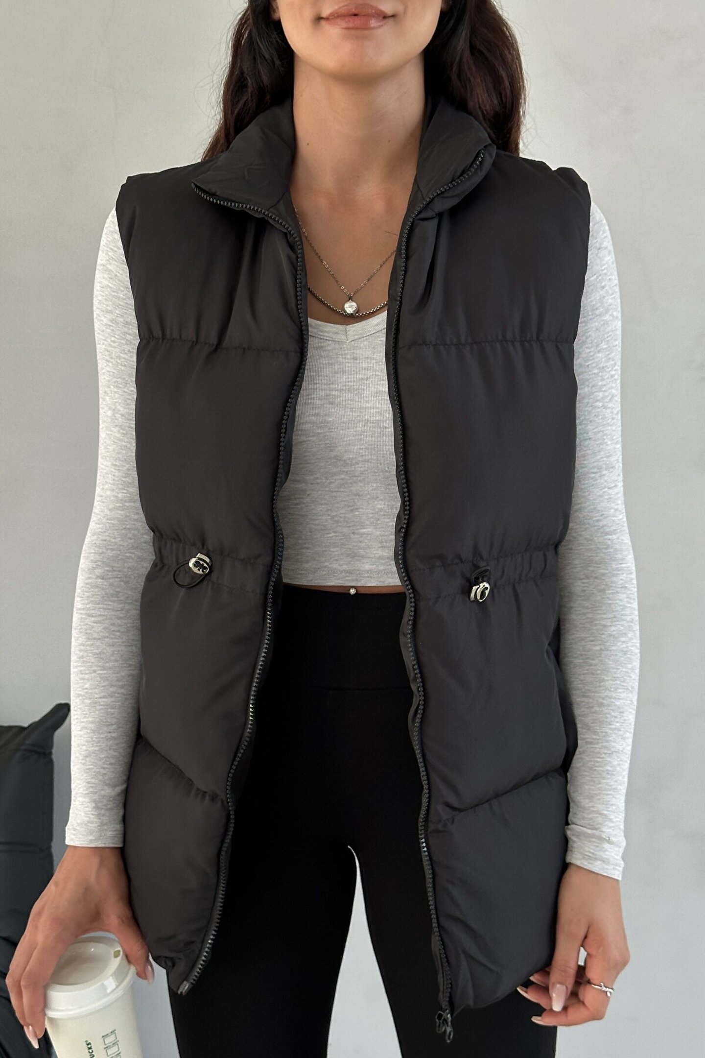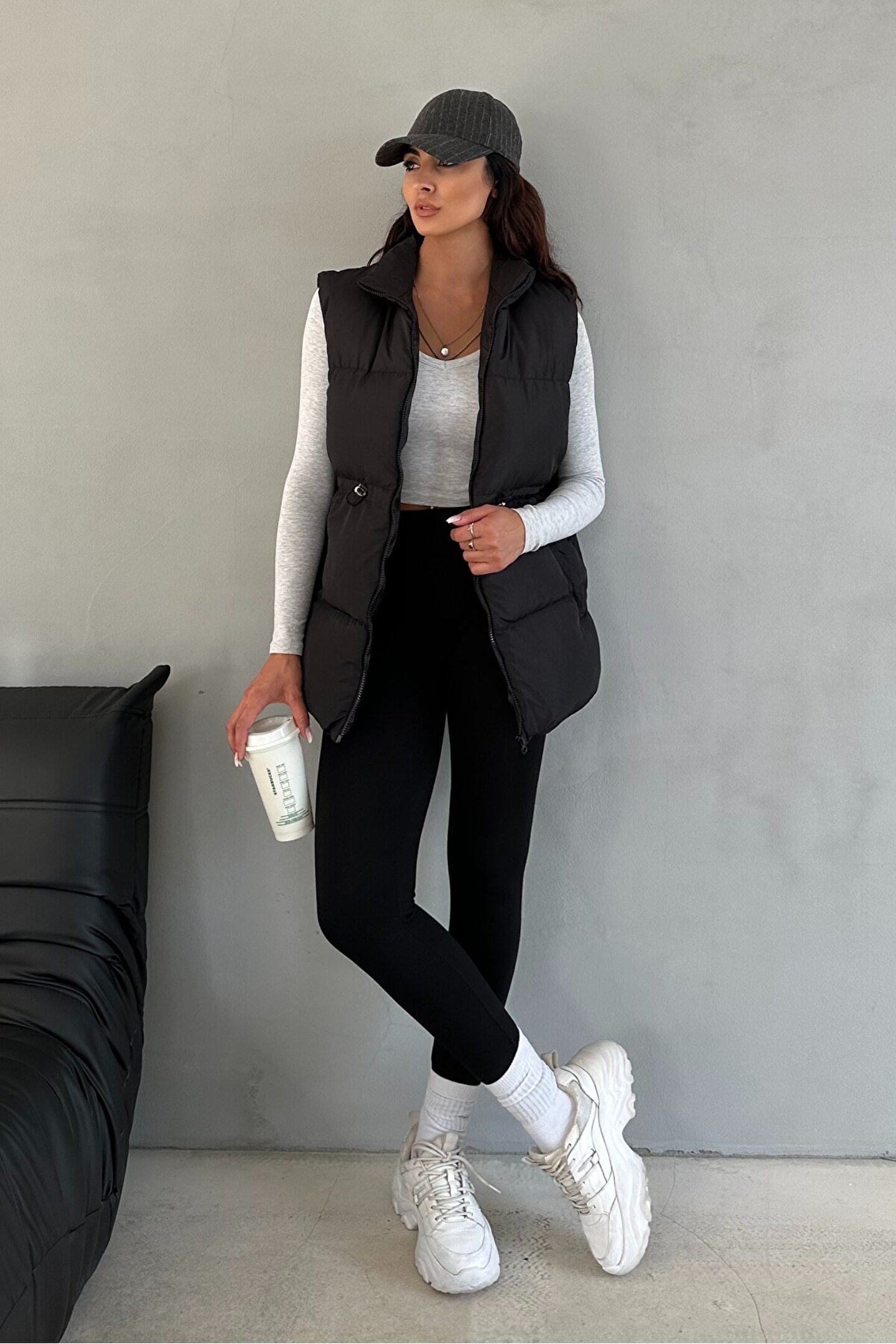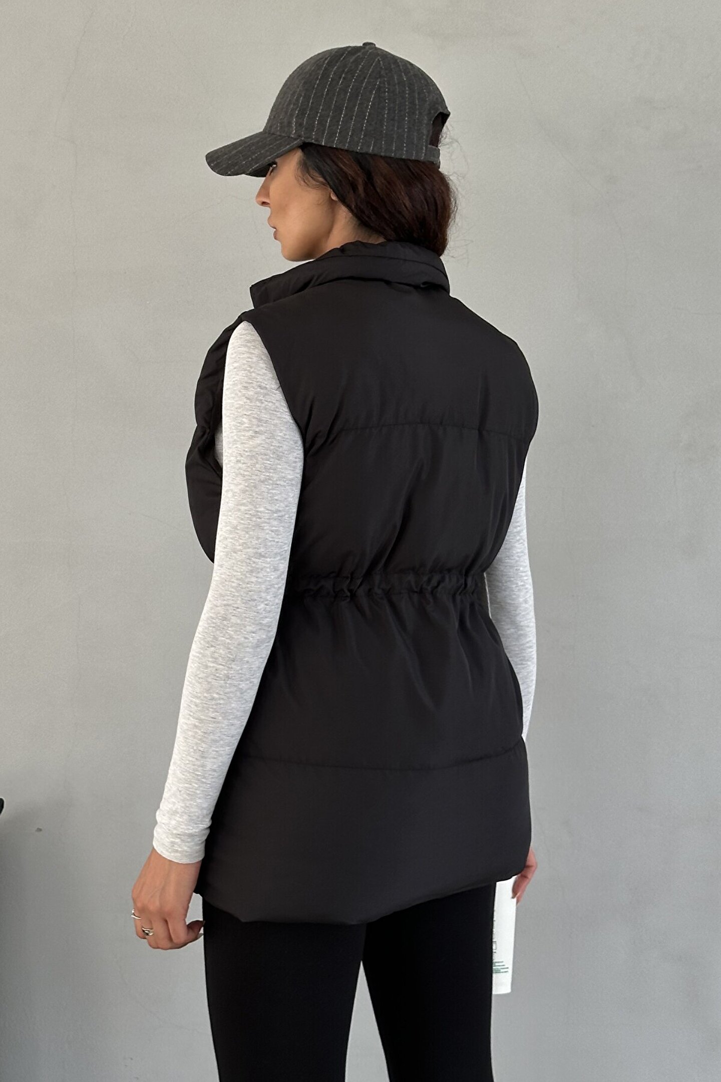 moda armanc Kadın Siyah Şişme Yelek - Kapüşonsuz Uzun Fermuarlı Cepli Kışlık Spor Şişme Mont Yelek