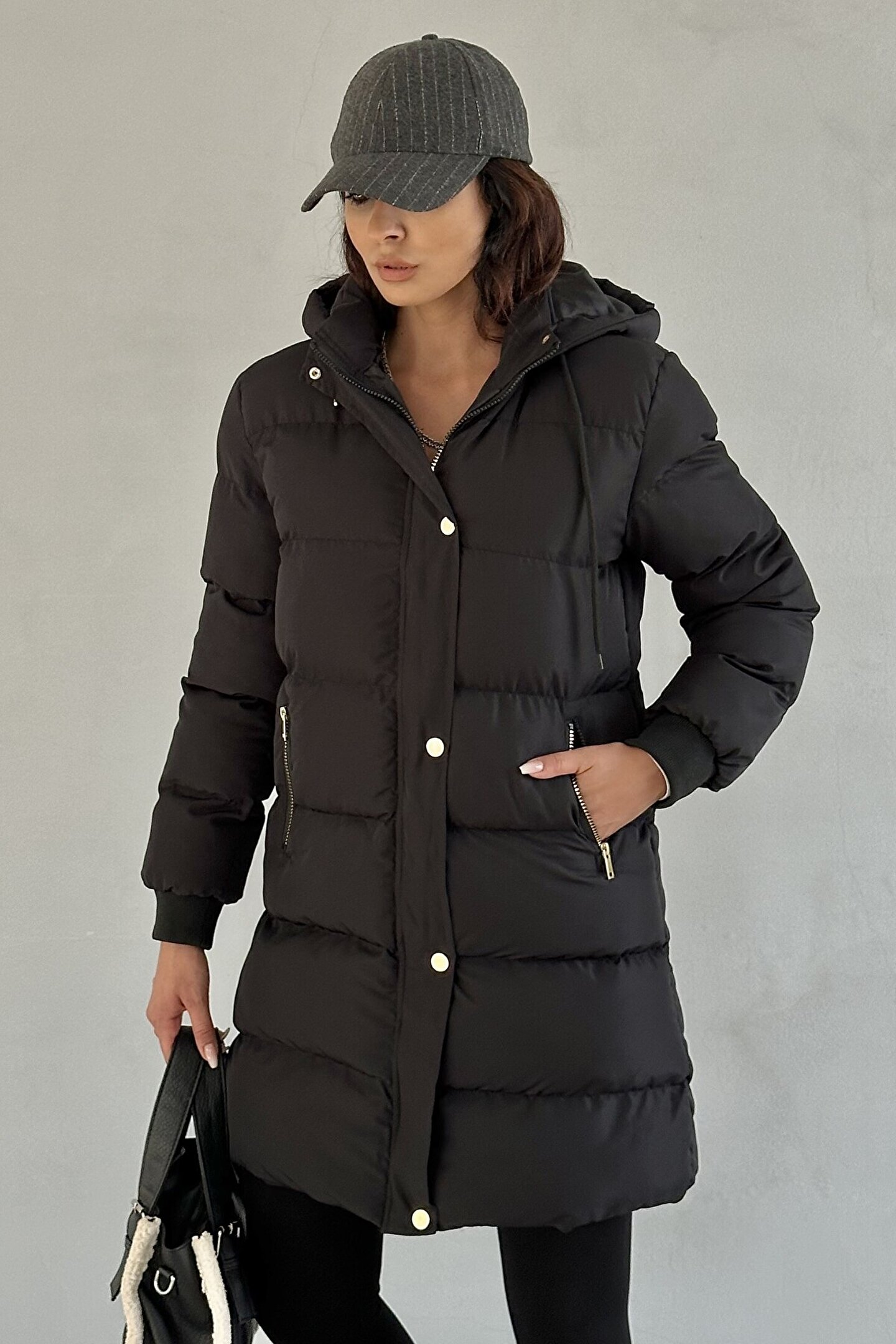 moda armanc Kadın Siyah Uzun Şişme Mont - Kapüşonlu, Gold Detaylı