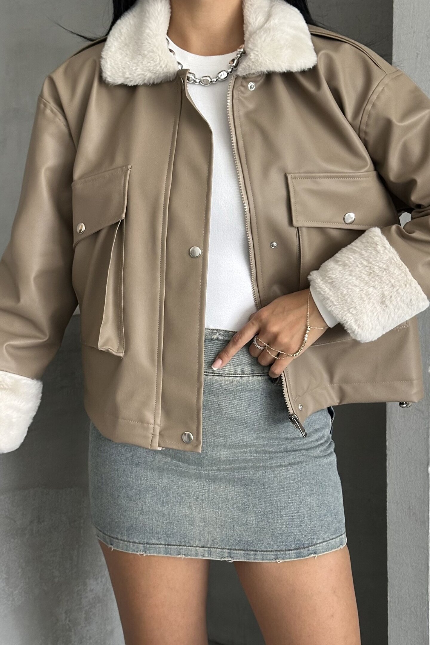 • Yeni sezonun en trend dış giyim parçası: kürk yakalı suni deri bomber ceket!