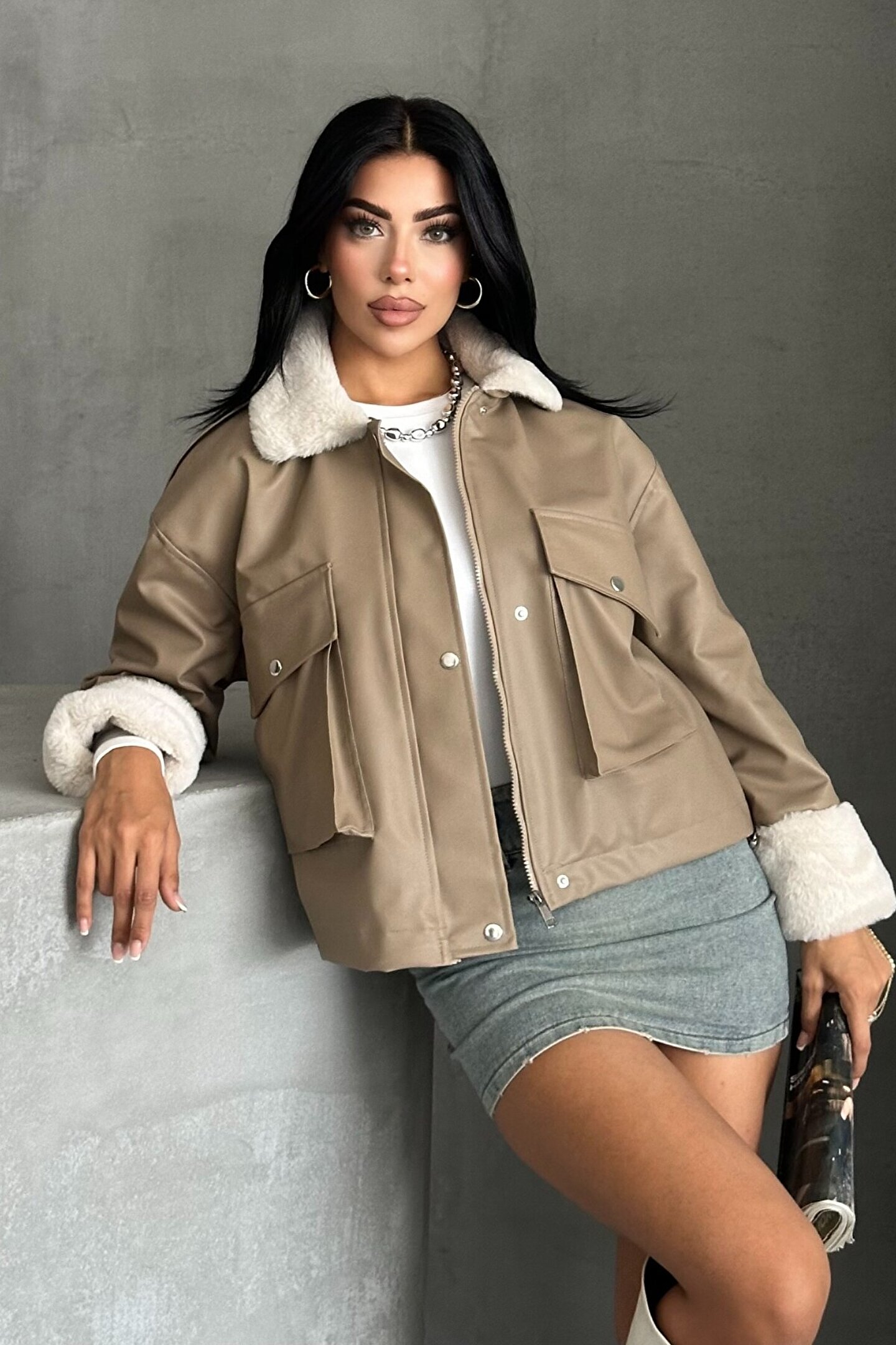 • Şehirli, modern ve özgüvenli görünümün anahtar parçası olan bu ceket, oversize kesimi, peluş astarı ve çarpıcı deri dokusu ile sonbahar–kış modasında öne çıkıyor.