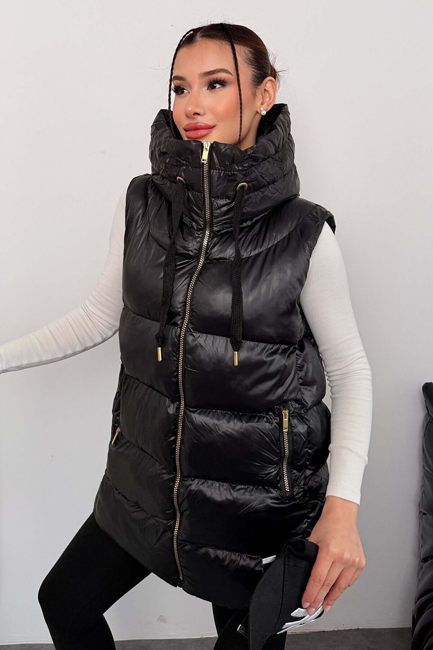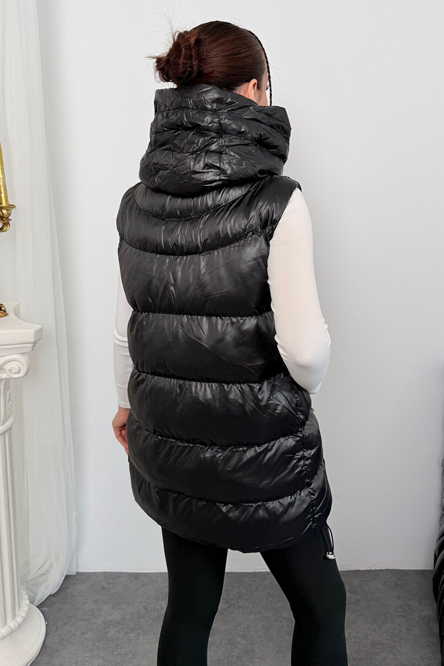 moda armanc Kadın Uzun Siyah Kapüşonlu Şişme Yelek – Astronot Yaka, Su Geçirmez, Oversize