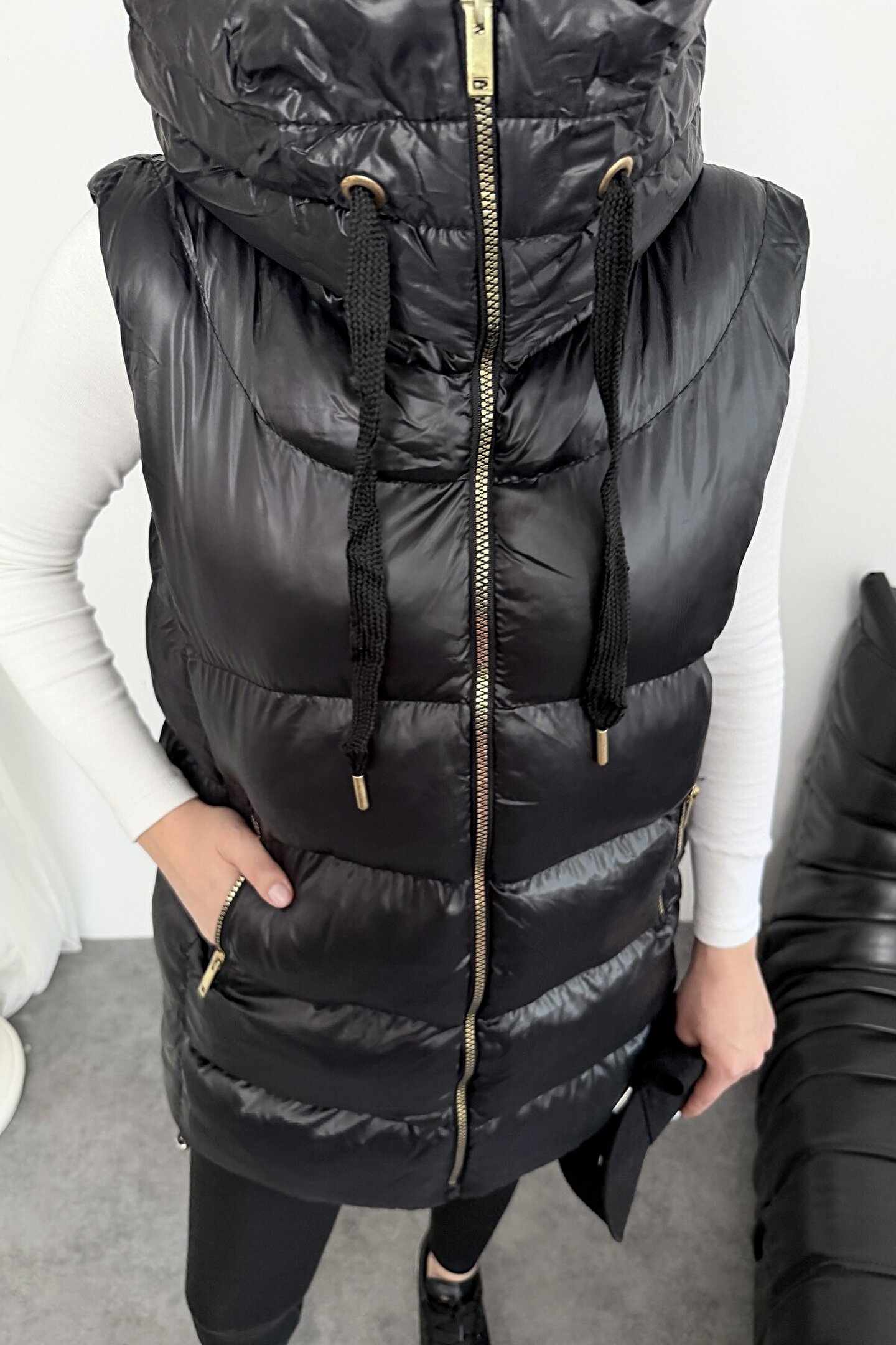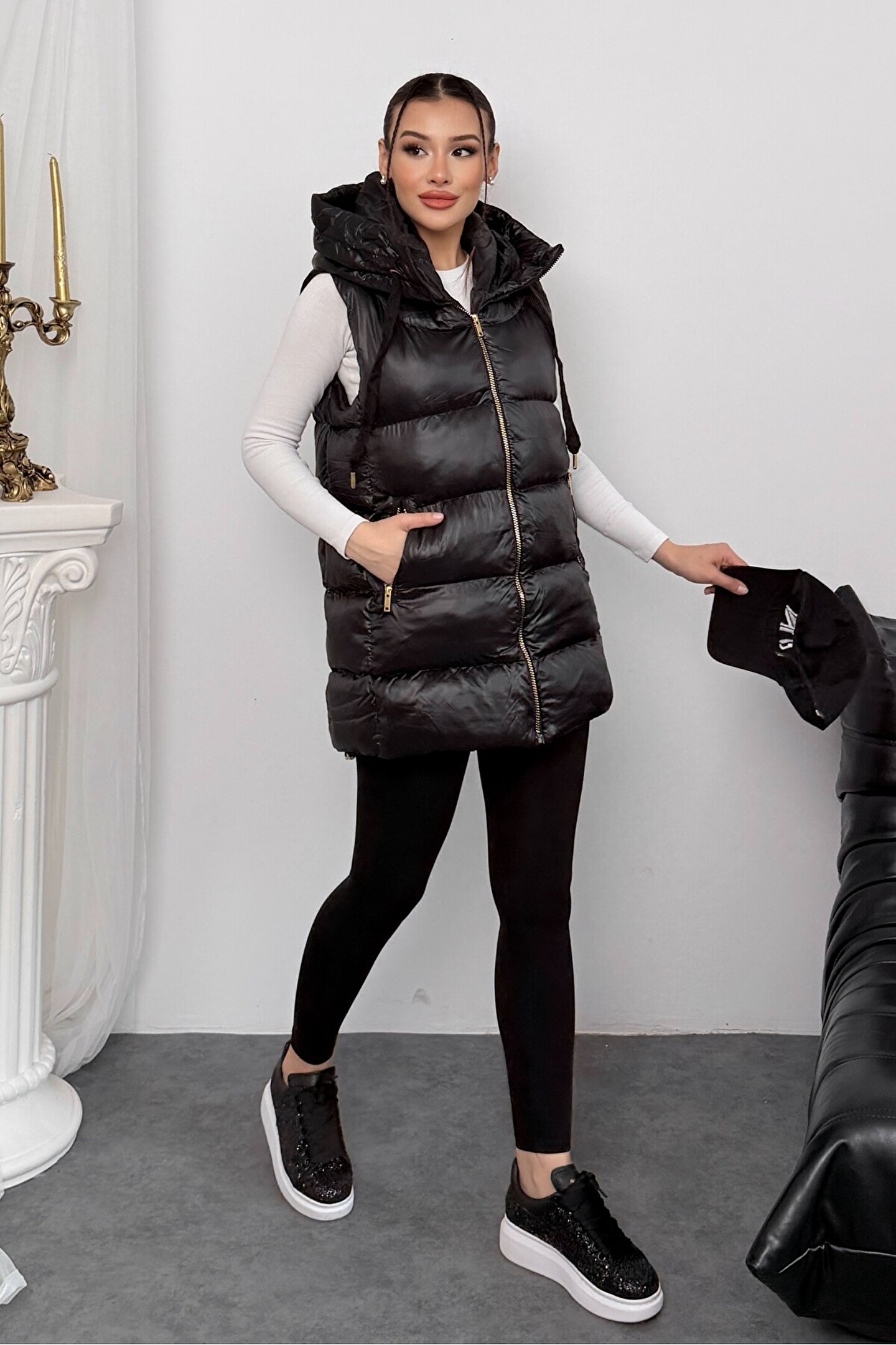 moda armanc Kadın Uzun Siyah Kapüşonlu Şişme Yelek – Astronot Yaka, Su Geçirmez, Oversize