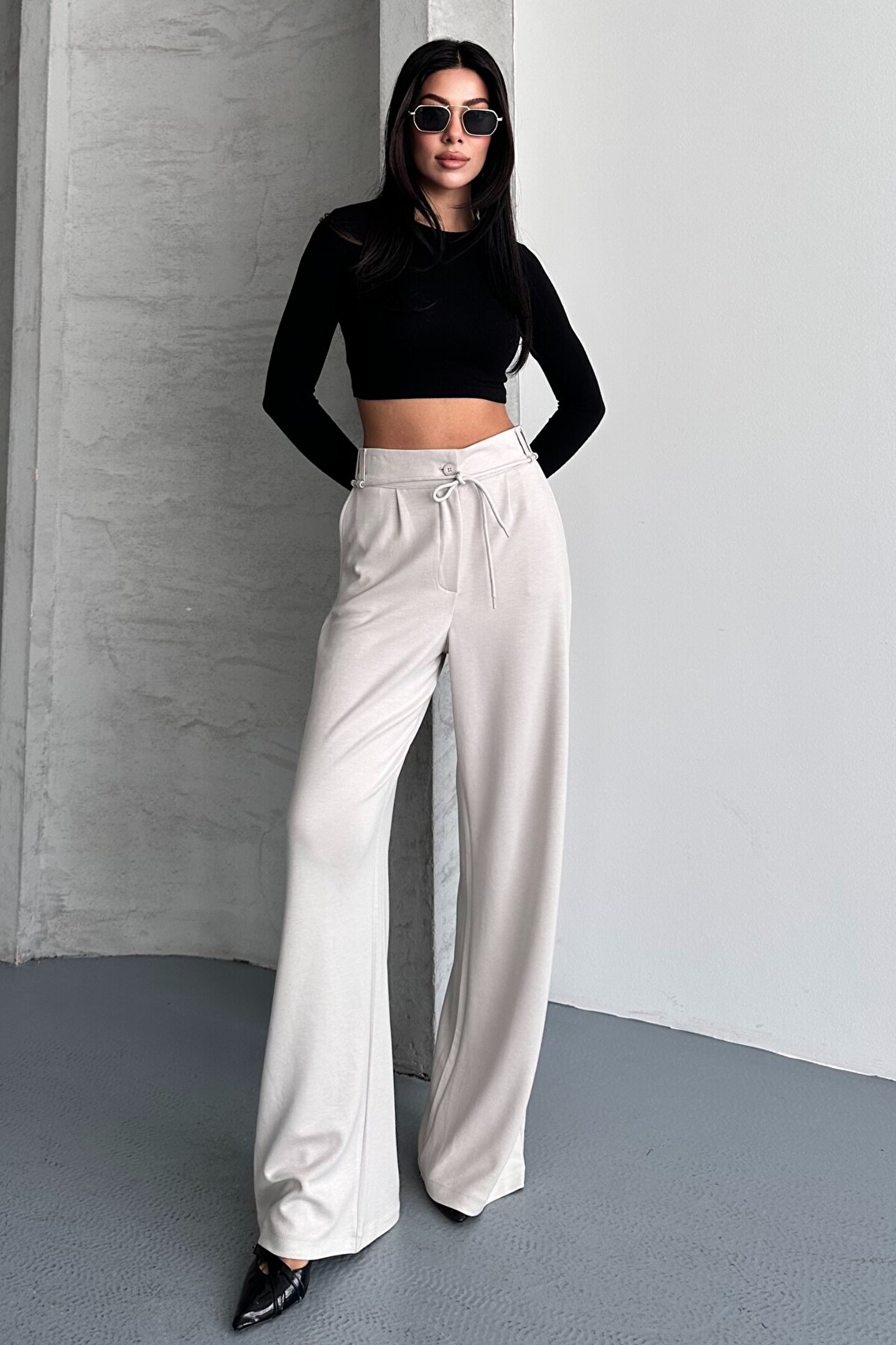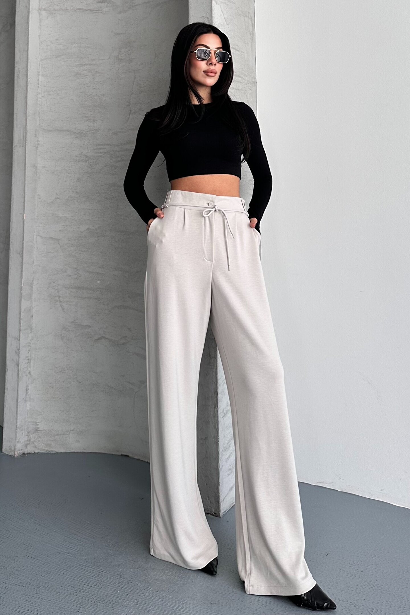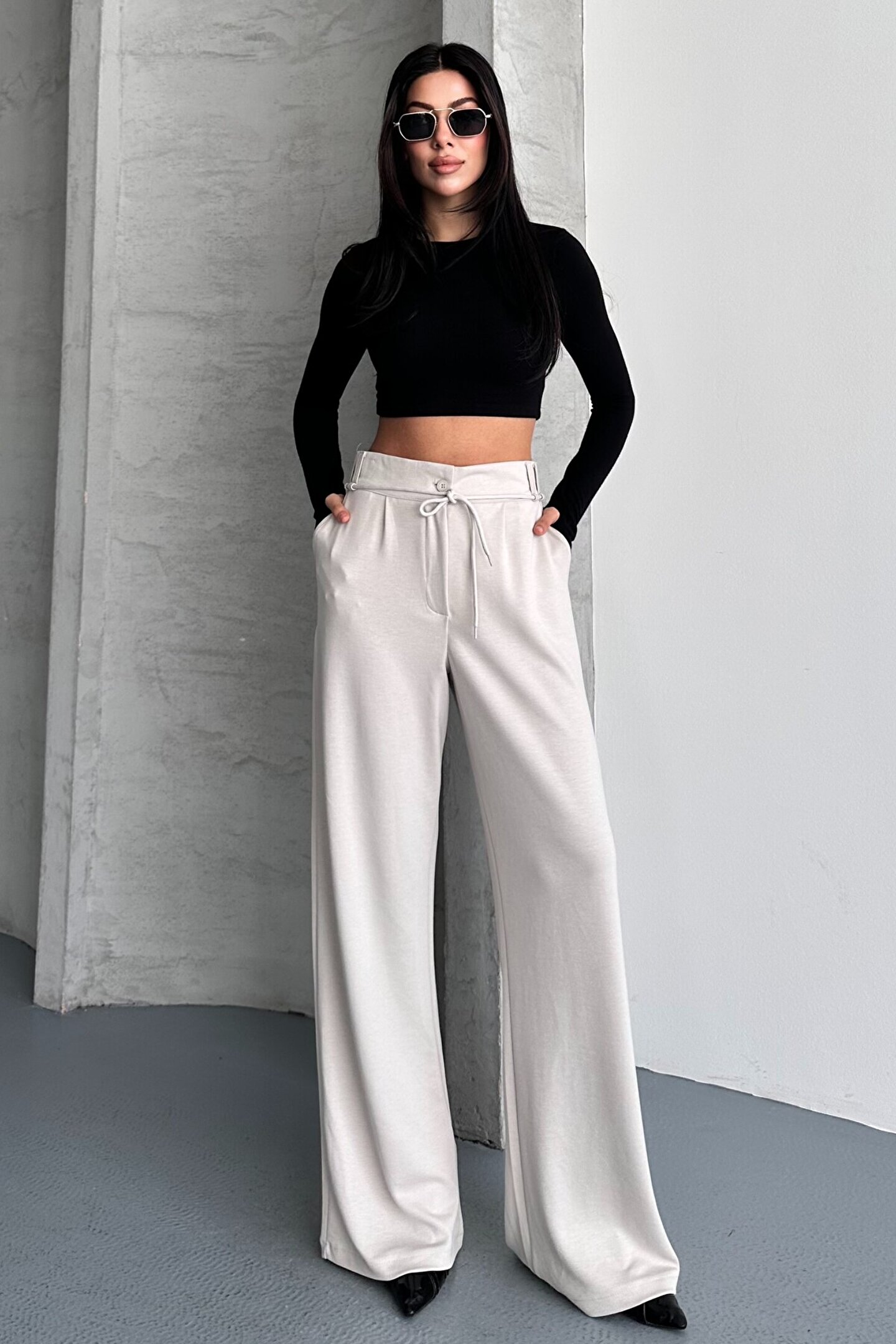 • Modern şehir stilinin vazgeçilmezi olan yüksek bel bağcıklı palazzo pantolon, rahat kesimi ve akıcı duruşu ile gün boyu konfor ve şıklığı bir arada sunar.