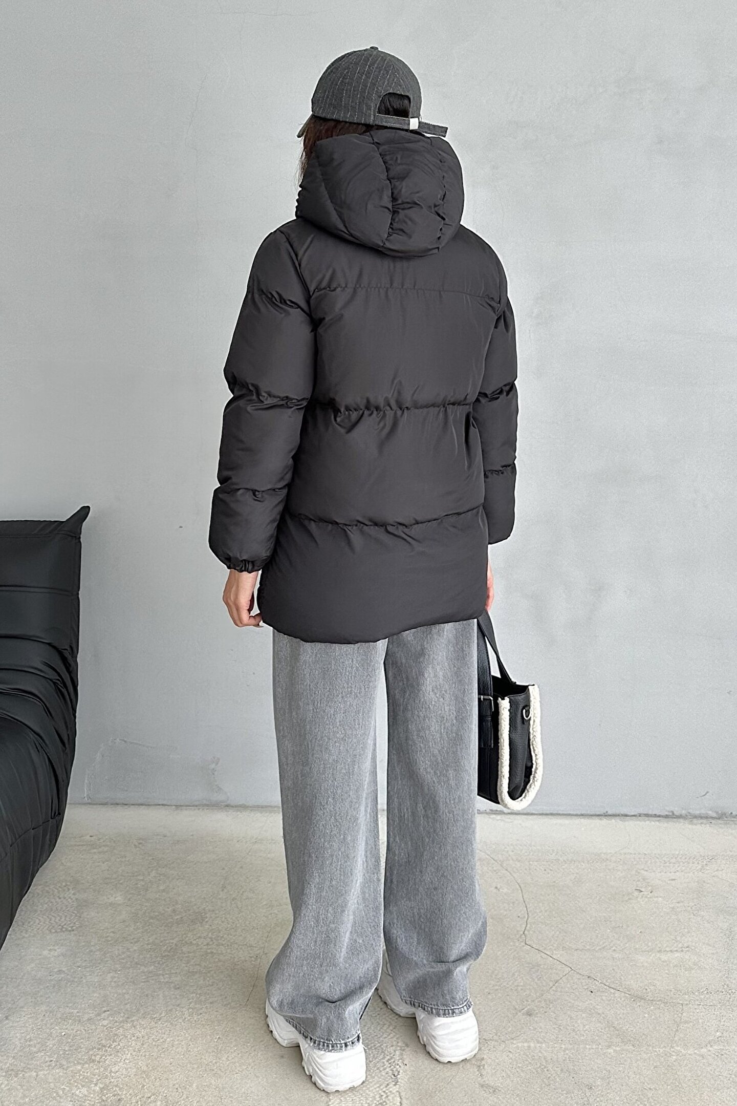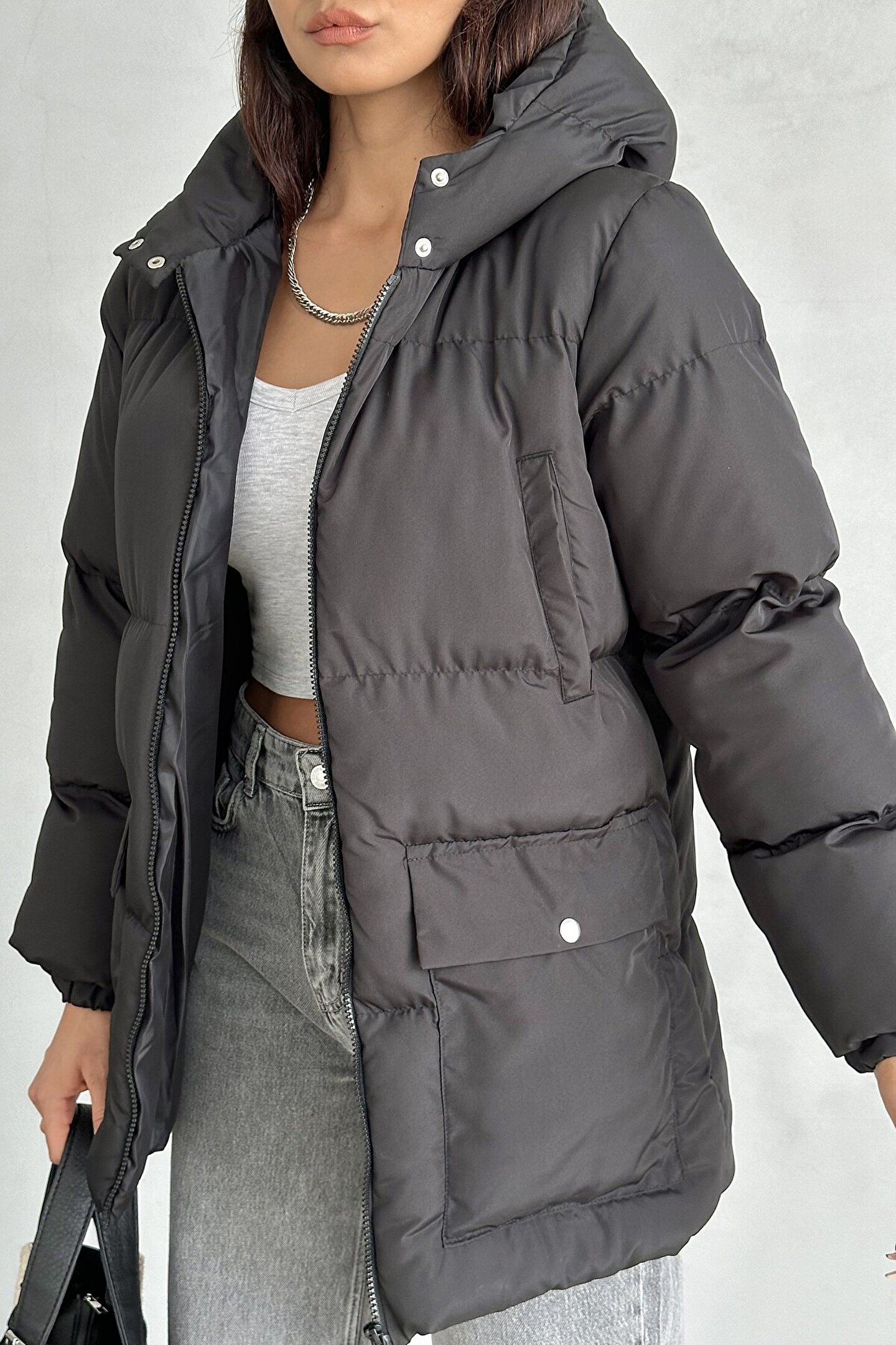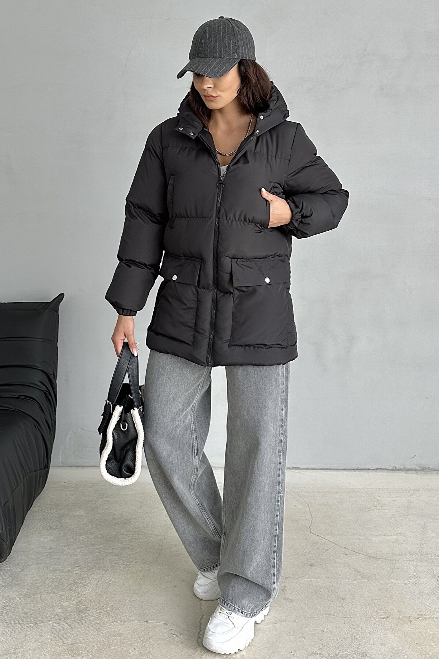 moda armanc Kapüşonlu Oversize Kadın Siyah Şişme Mont - 4 Cep Detaylı