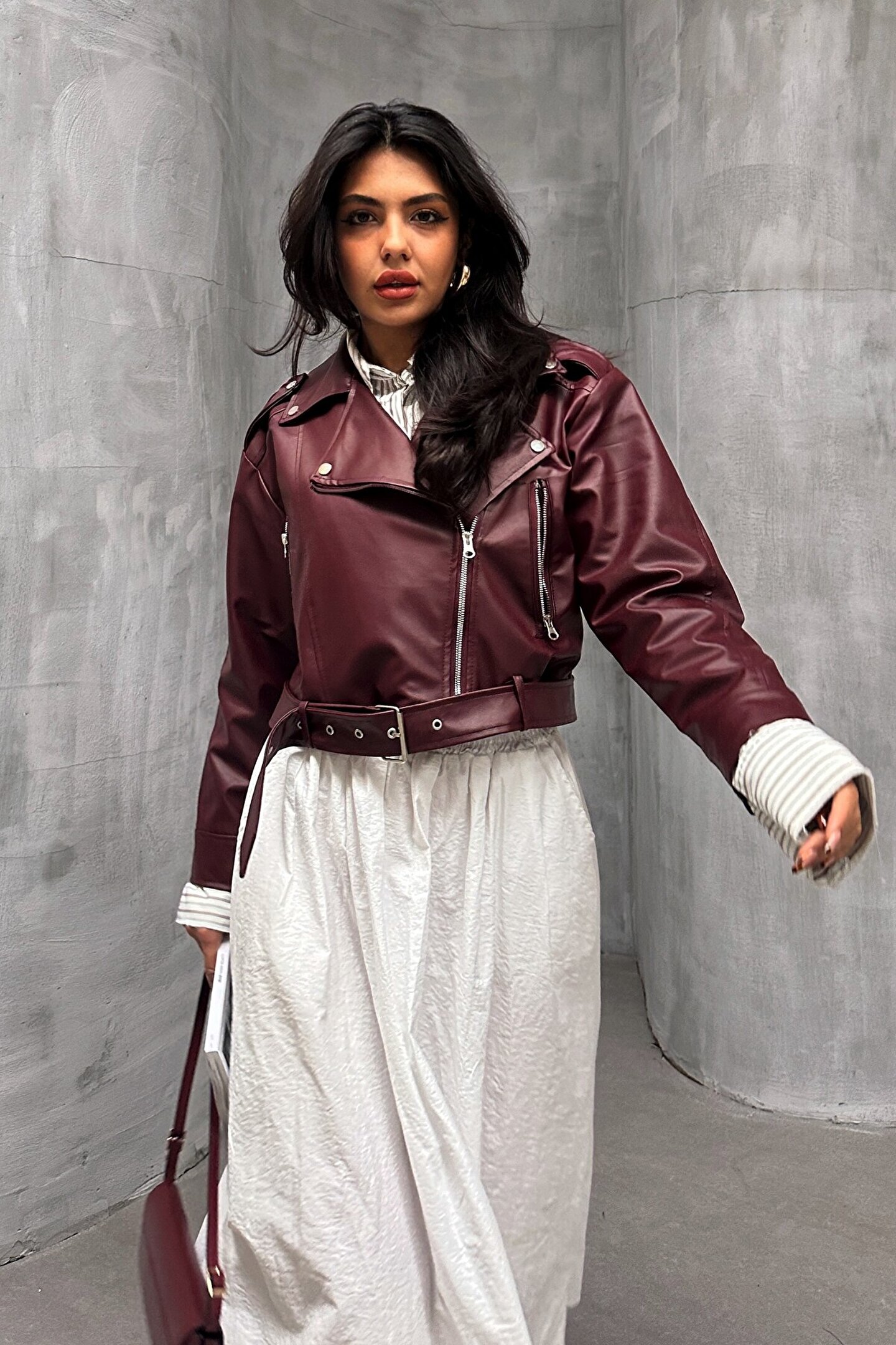 - Zarif bordo tonlarında tasarlanmış, şıklığı ve rahatlığı bir arada sunan deri ceket.; - Genç ve dinamik tarza hitap eden modern kesimiyle günlük kombinlerinizde fark yaratır.; - Casual ortamlara uygun olarak tasarlanmıştır; hem şehir içinde hem de dış mekan aktivitelerinde rahatlıkla tercih edebilirsiniz.