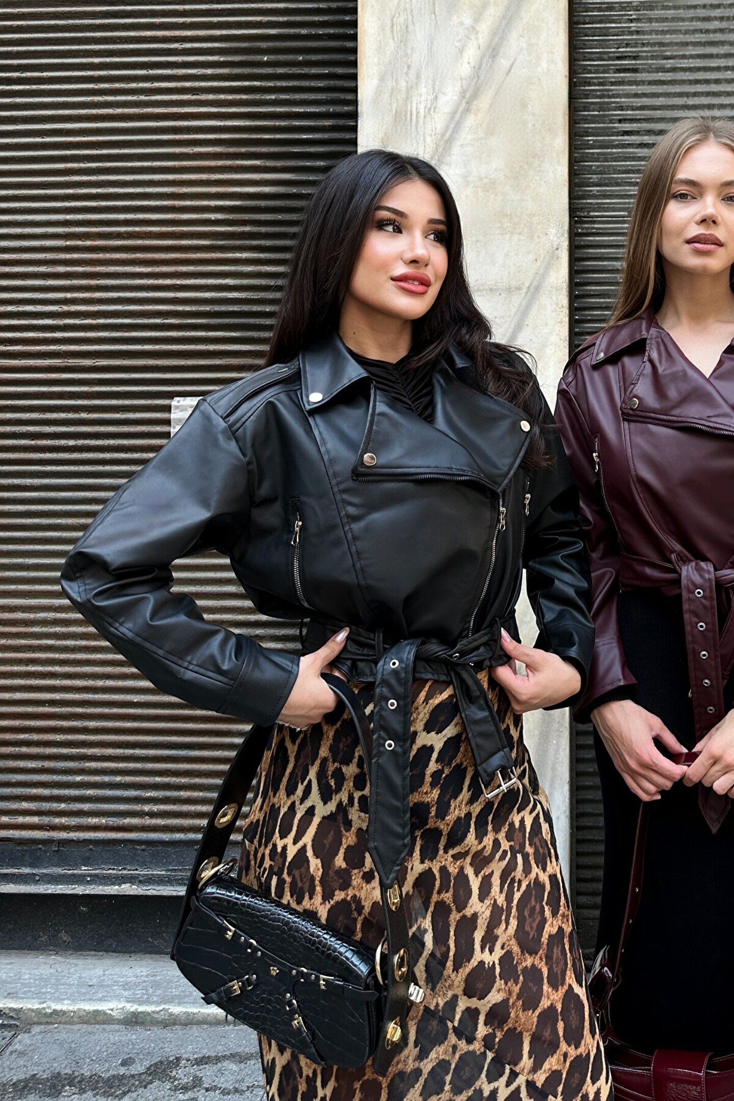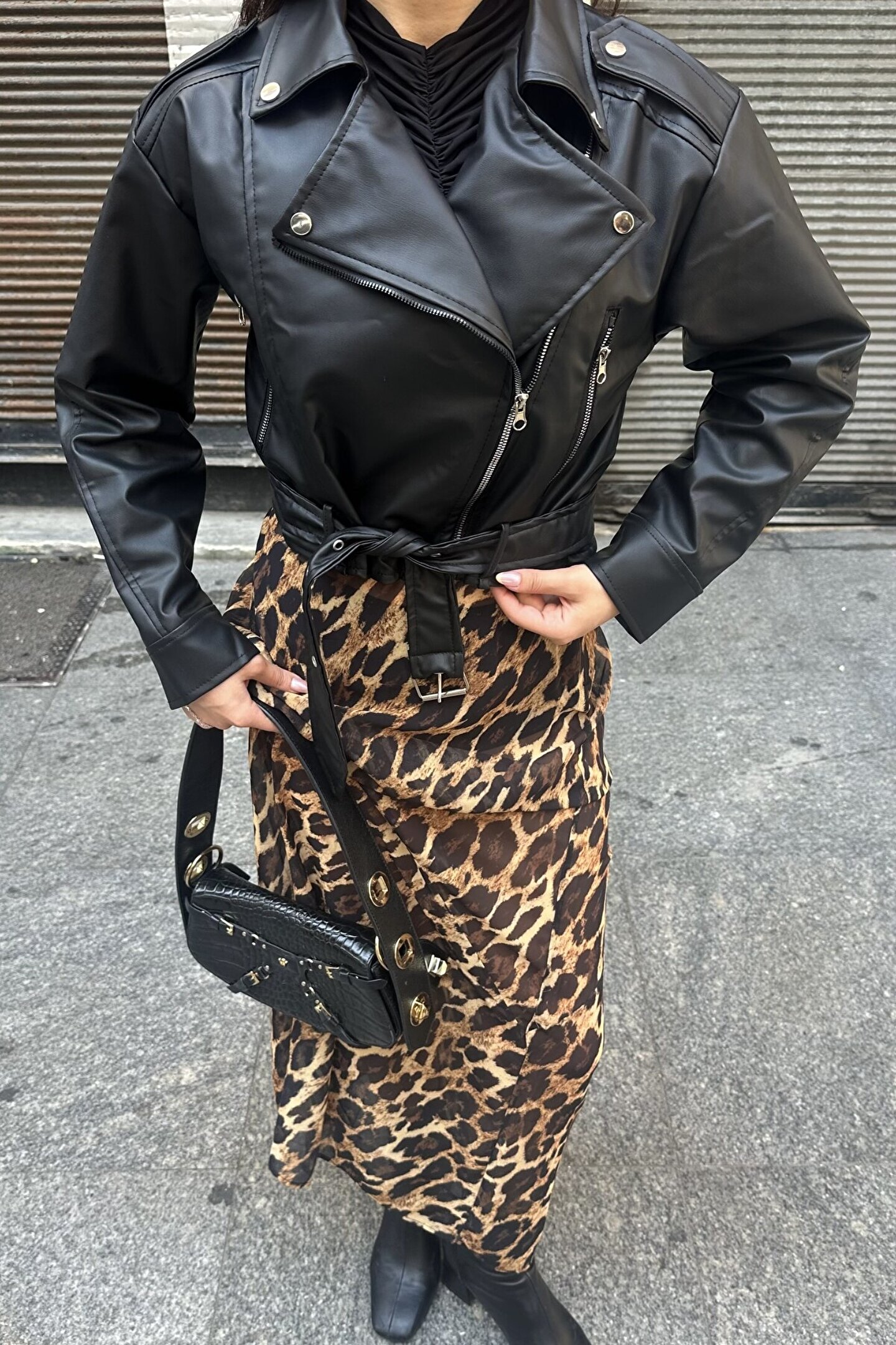 moda armanc Kemerli Oversize Crop Siyah Deri Ceket