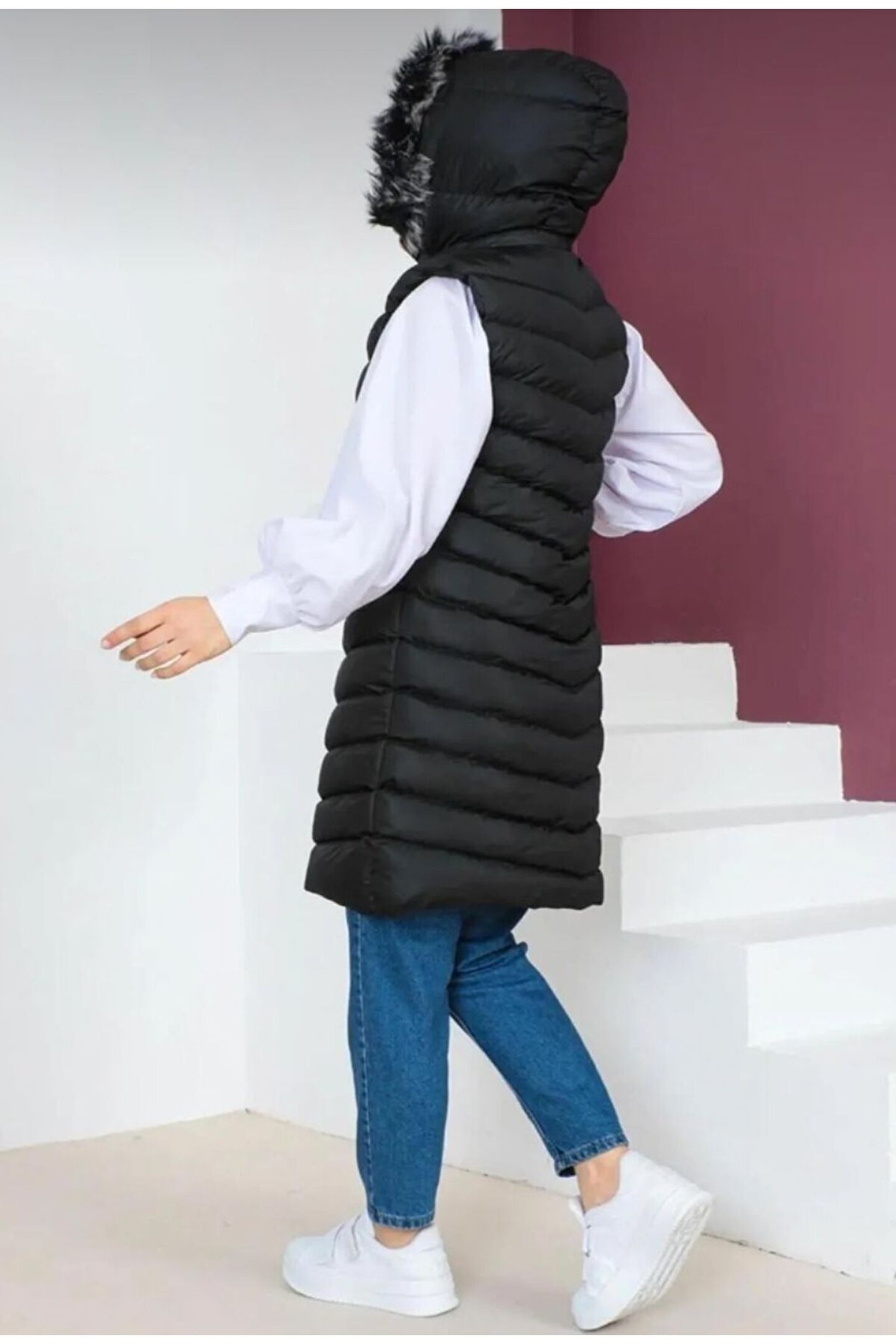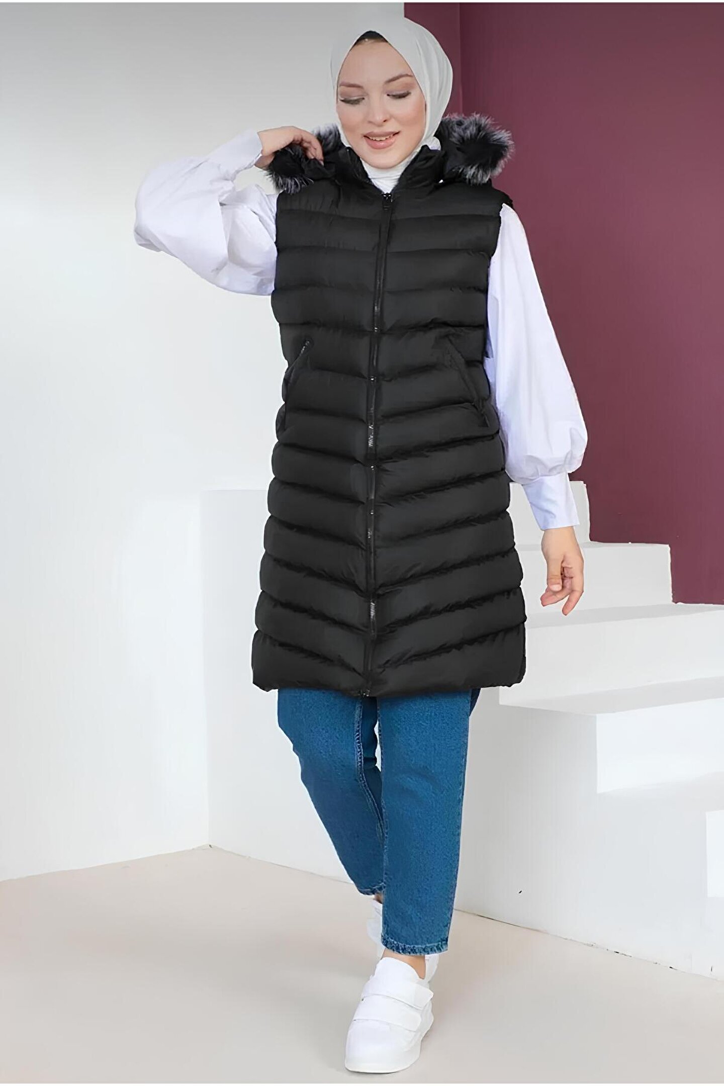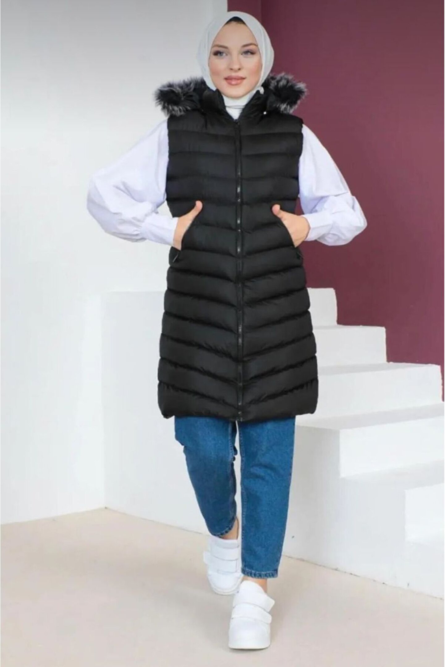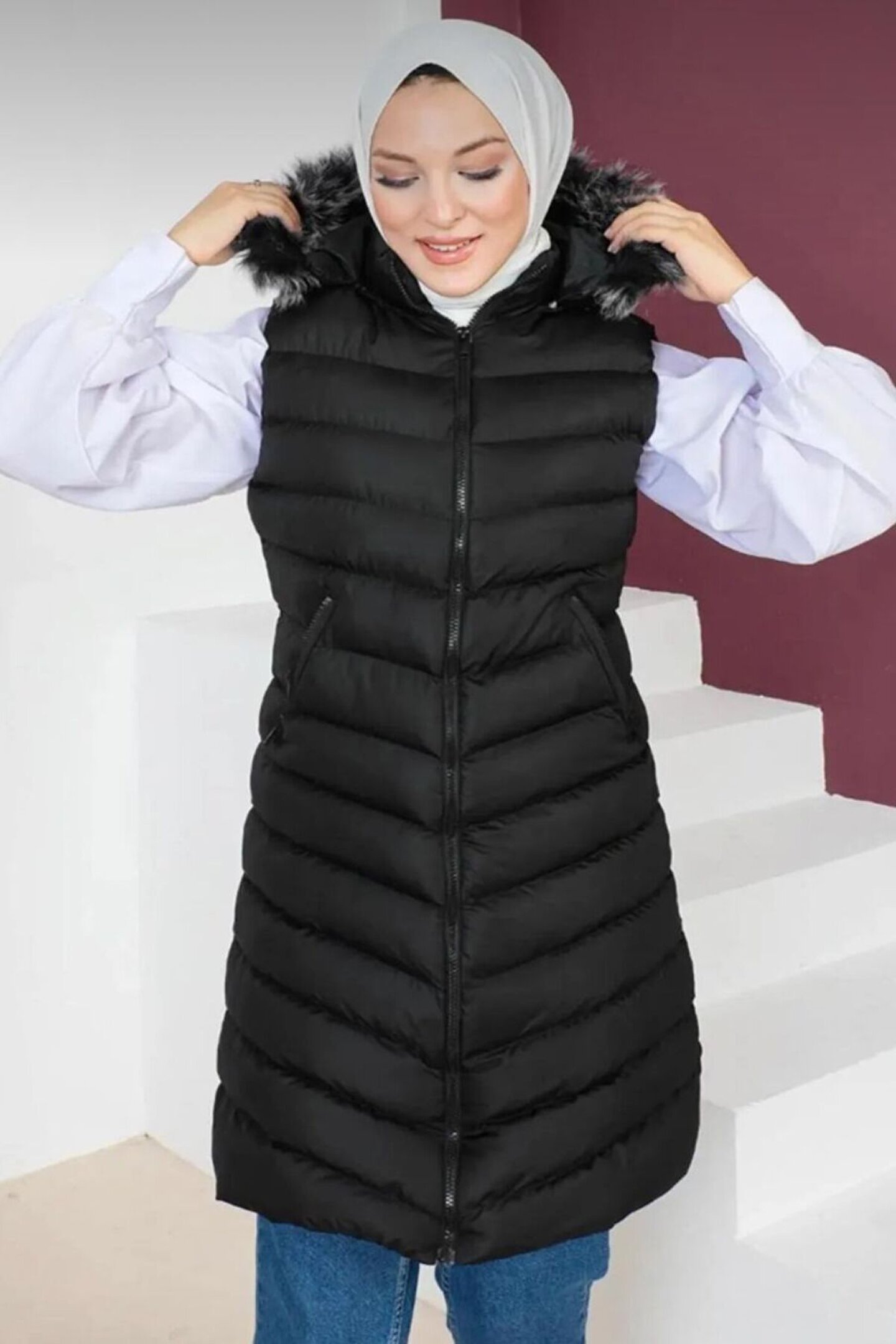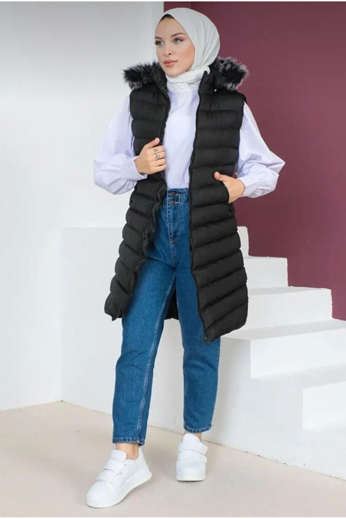 - Sade ve şık tasarımıyla her ortama uyum sağlayan düz desenli yelek, günlük kullanım için idealdir; - Yüksek kaliteli dolgu tekniği ile doldurulmuş yapısı sayesinde soğuk havalarda sıcak tutar ve konforlu bir deneyim sunar; - Uzun boy kesimi ile hem şıklığı hem de koruyuculuğu bir arada sunarak tesettür giyim koleksiyonunuzun vazgeçilmez parçası haline gelir; - %75 polyester ve %25 pamuk karışımından oluşan materyal bileşeni, dayanıklılığı artırırken yumuşak bir dokunuş sağlar; - Kapüşonlu yaka tipi ile başınızı soğuktan korurken, fermuarlı kapama şekli pratik kullanım imkanı tanır; - Basic siluetiyle zamansız bir tarz yaratırken, tüm yaş gruplarına hitap eden geniş kullanım yelpazesi sunar; - Micro dokuma tipi sayesinde hafiflik ve dayanıklılığı bir arada bulundurur; böylece hareket özgürlüğünüz kısıtlanmaz; - Type 1 yıkama talimatına uygun şekilde kolayca temizlenebilir; böylece ürününüz uzun süre ilk günkü gibi kalır.; - Su geçirmez özelliği;