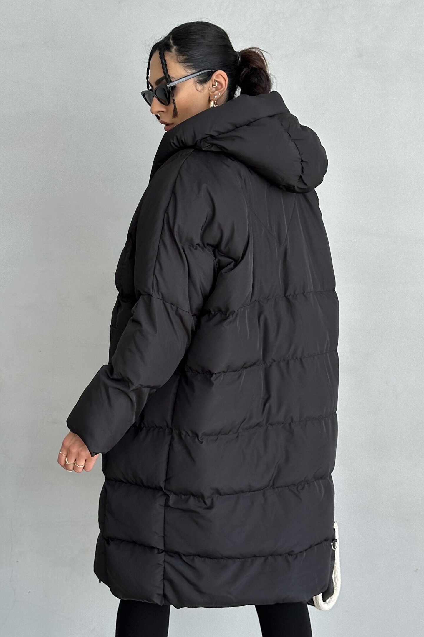 moda armanc Puffer Siyah Kapüşonlu Uzun Kadın Şişme Mont - Yarasa Kol