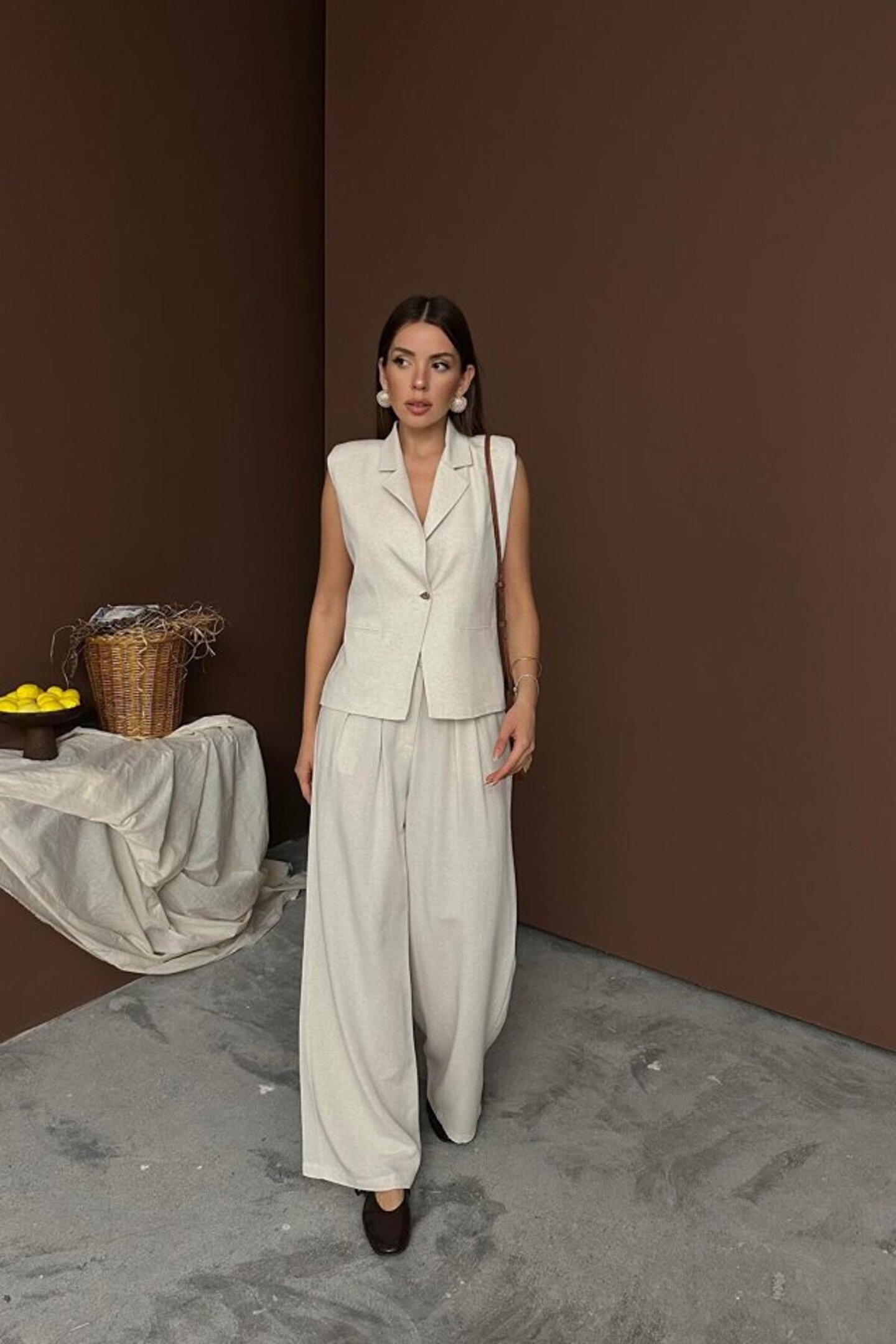 Bej Keten Yelek Pantolon Takım.; Ürün detayları ve kullanım hissi kişisel tercihlere göre değişiklik gösterebilir.