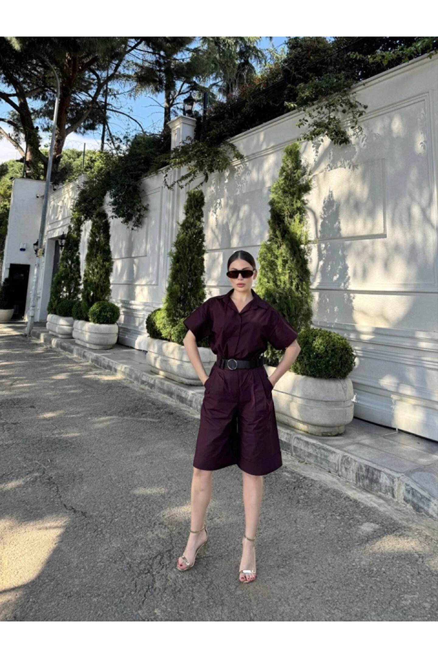 MODA Bordo Kemerli Gömlek Şort Kadın Takım