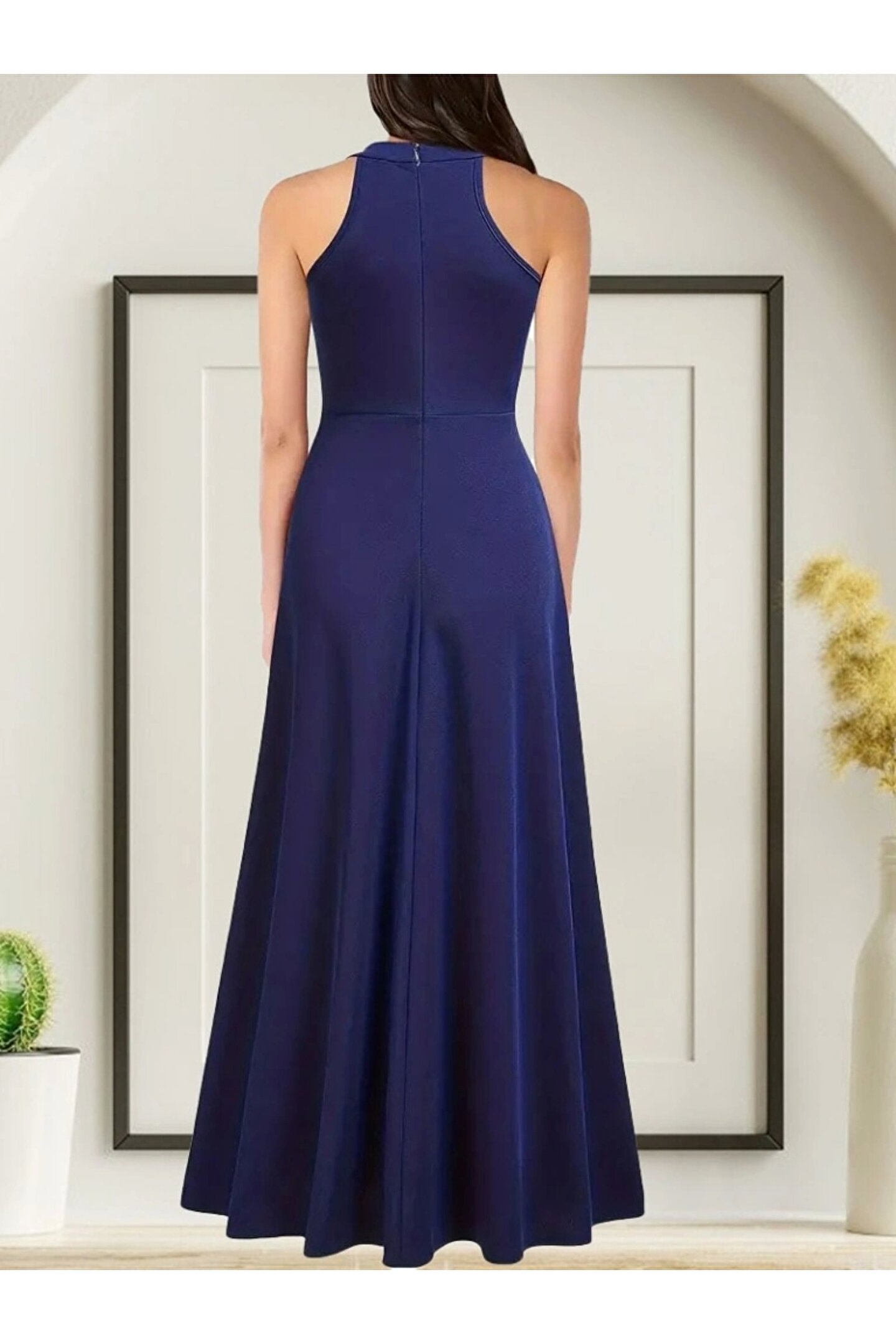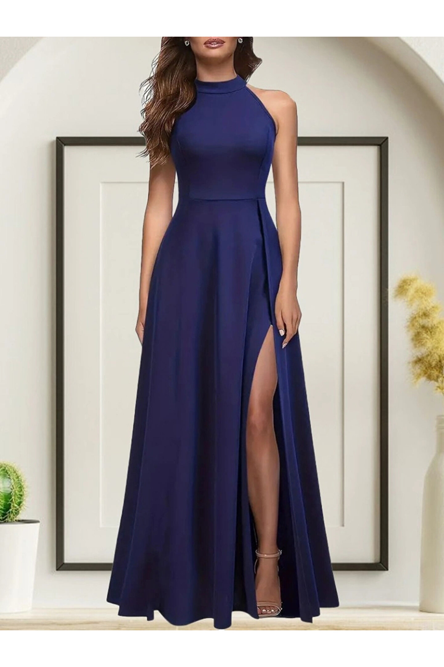 Kadın Halter Yaka Derin Yırtmaç Detaylı Tam Boy Janjan Krep Abiye Elbise