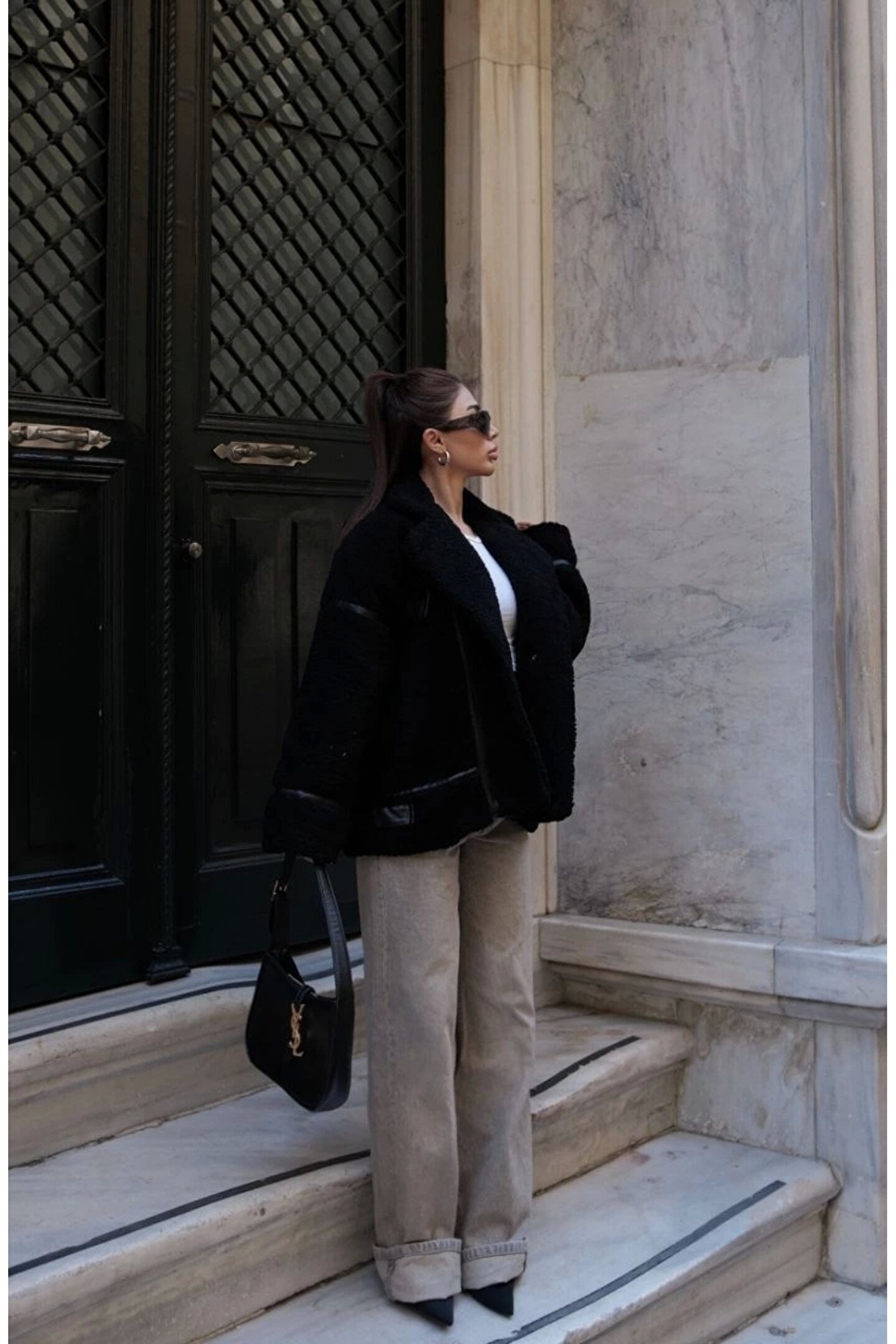 Cıt Cıt Detaylı Peluş Mont Ceket - Siyah