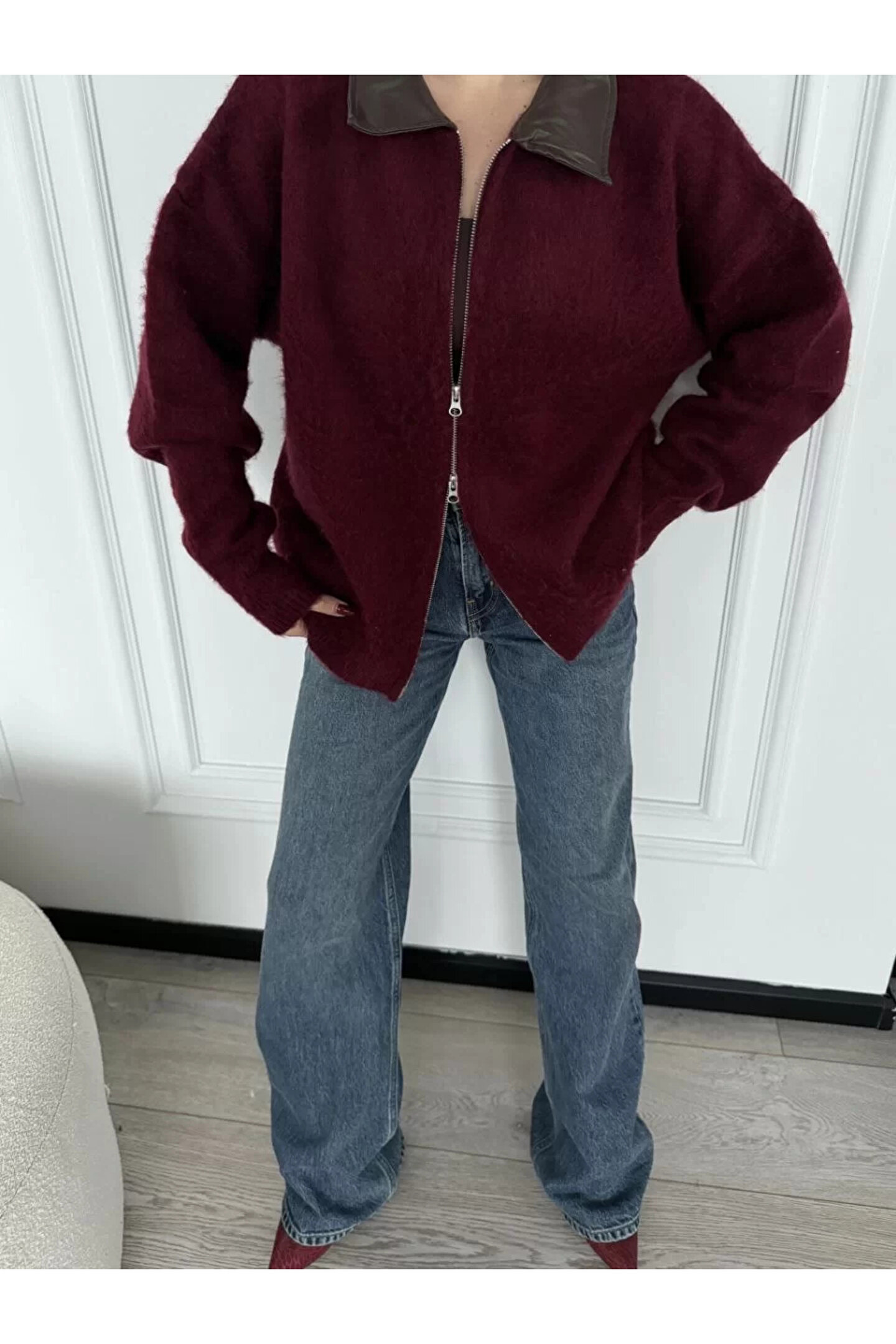 MODA Deri Yakalı Pamuk dokulu Çift Taraflı Çalışan Fermuar Ceket - Bordo