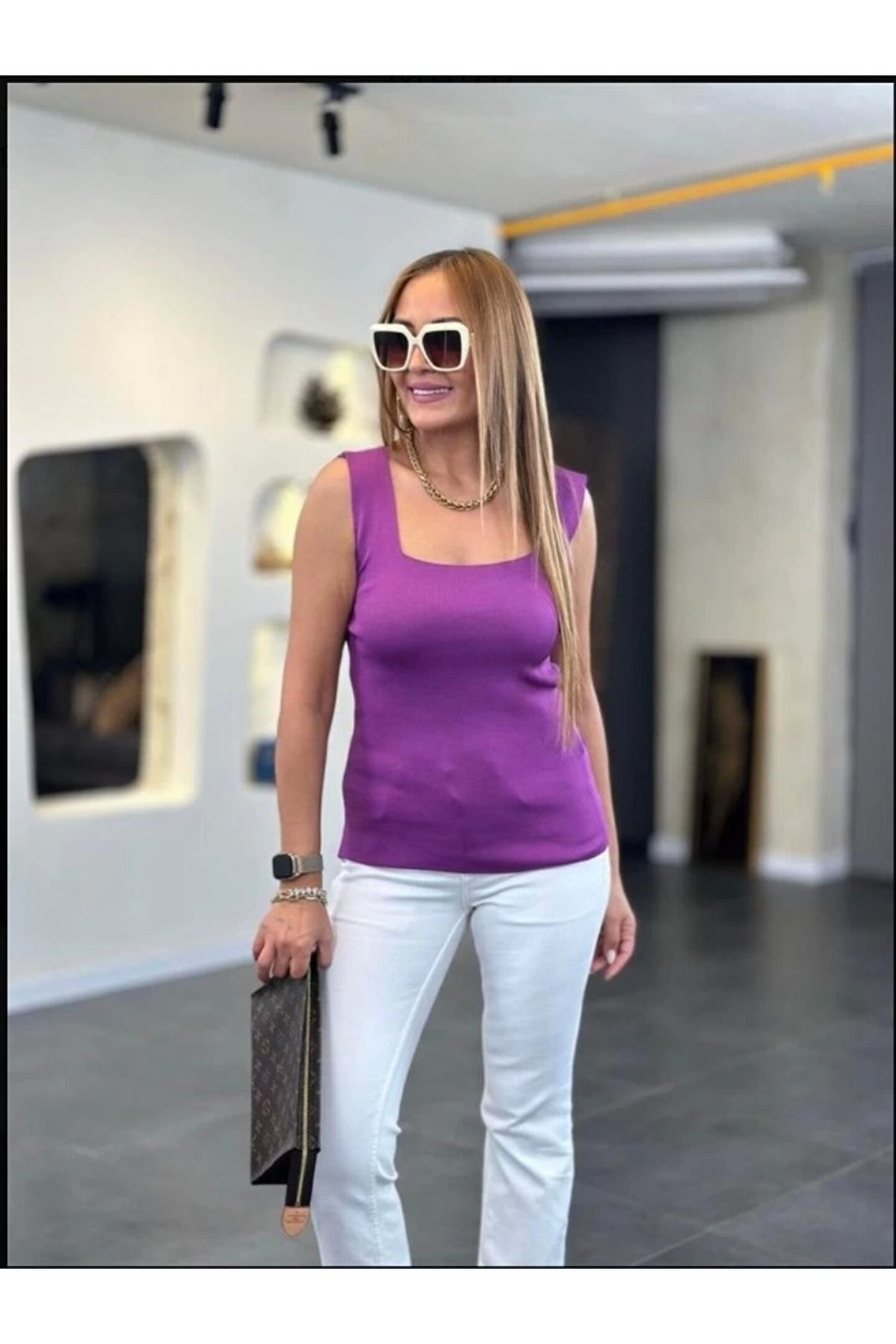 Kare Yaka Kalın Askılı Beyaz Triko Bluz