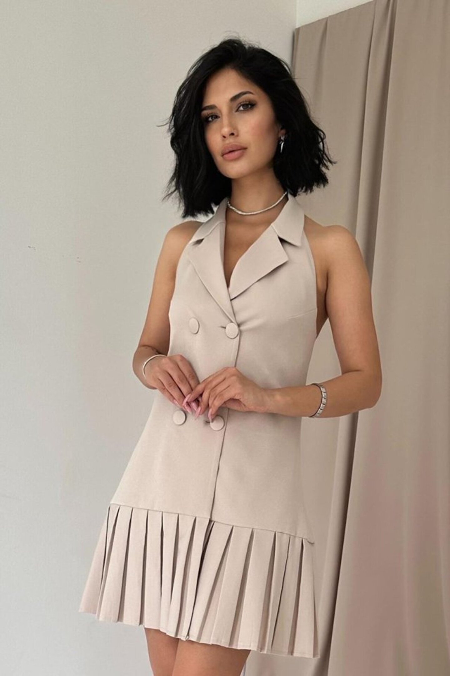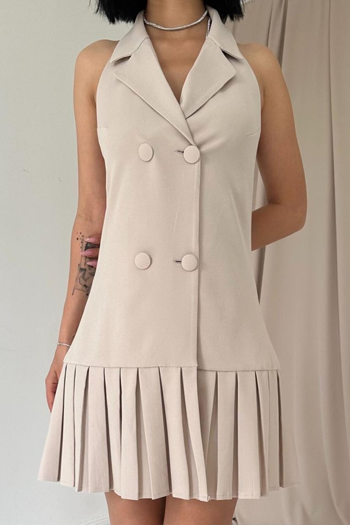 Bej Sırtı Açık Ceket Yakalı Elbise