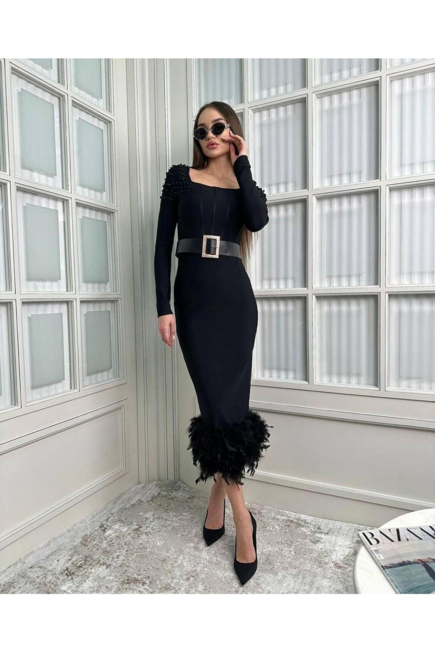 Kadın Etek Ucu Otriş Yakası Inci Detayli Midi Boy Elbise
