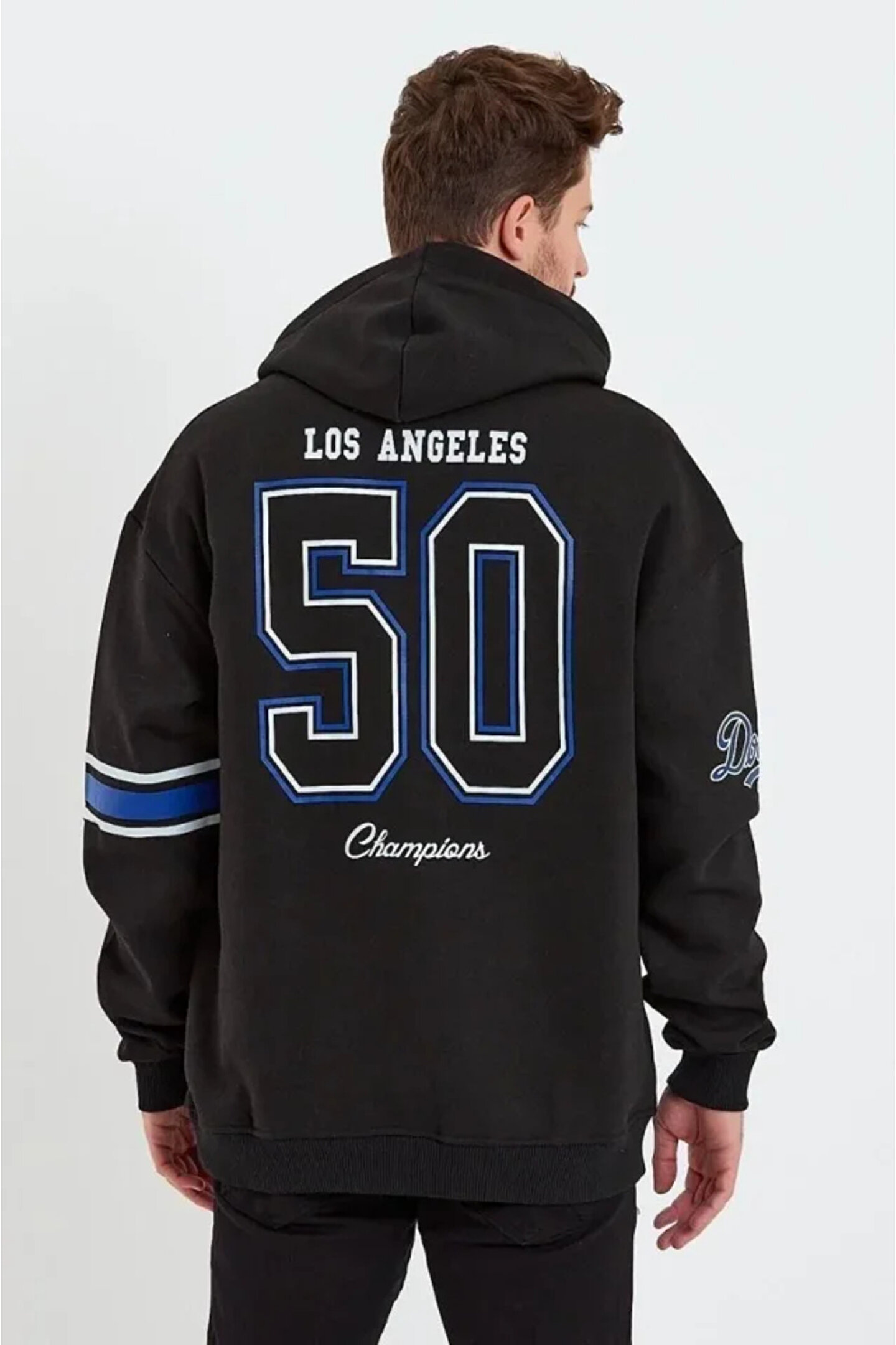MODA EQURİ Erkek Baskılı Kapşonlu Üç Iplik Oversize Sweatshirt - Siyah