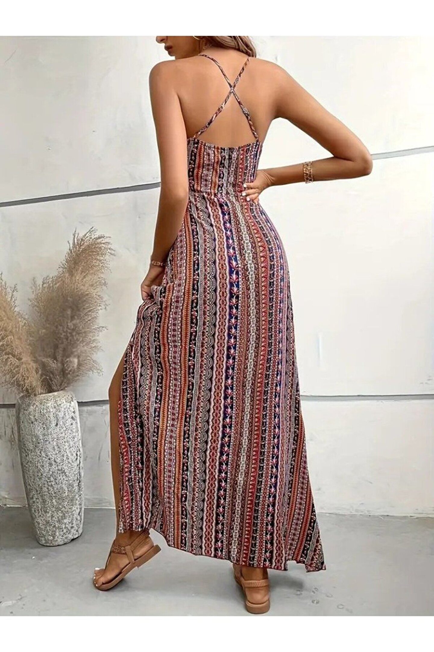 Kadın Ip Askılı Sırttan çapraz Detaylı Yırtmaçlı Desenli Süprem Elbise
