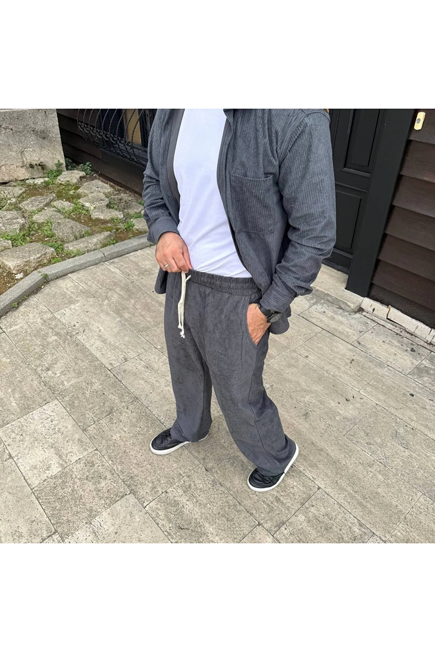 MODA Erkek Fitilli Kadife Cepli Buggy Pantolon Oversize Rahat Kalıp - Füme