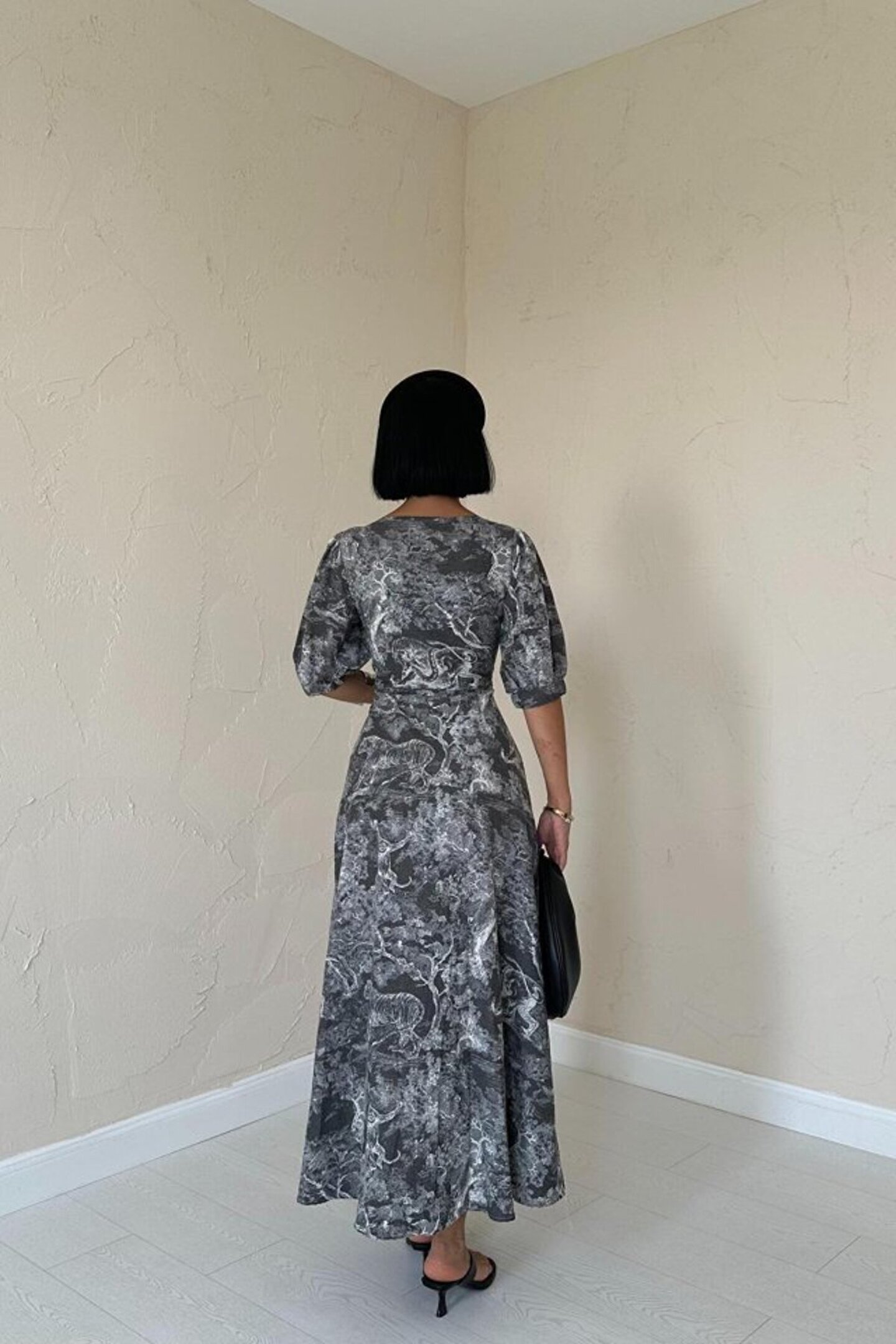 Haki Önü Düğmeli Kalp Yaka Elbise