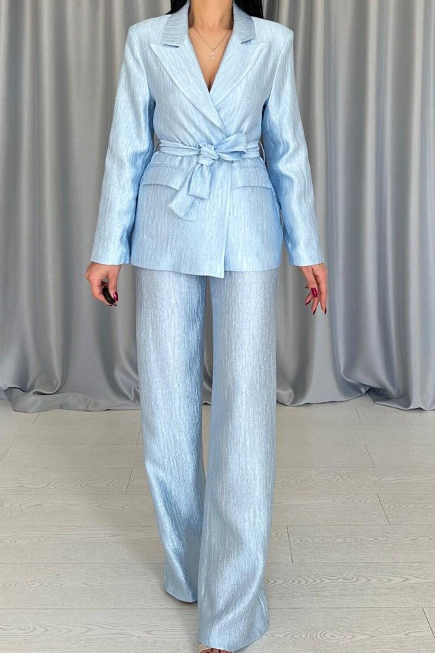MODA eyesof Mavi Beli Kuşaklı Ceket Ve Pantolon Parlak Takım