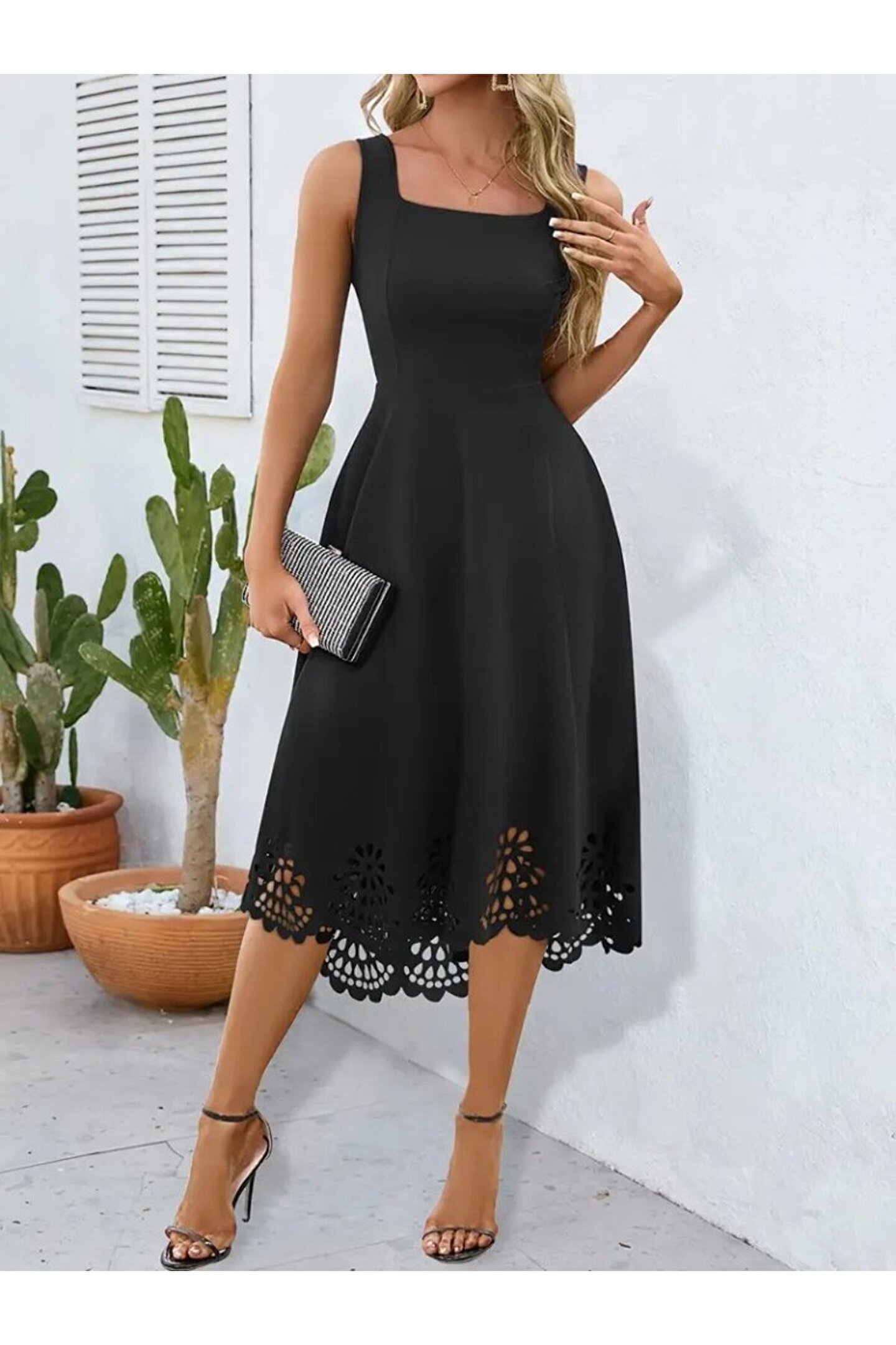 MODA Gökyüzü Kadın Askılı Geometrik Yaka çiçek Lazer Kesim Ithal Krep Elbise