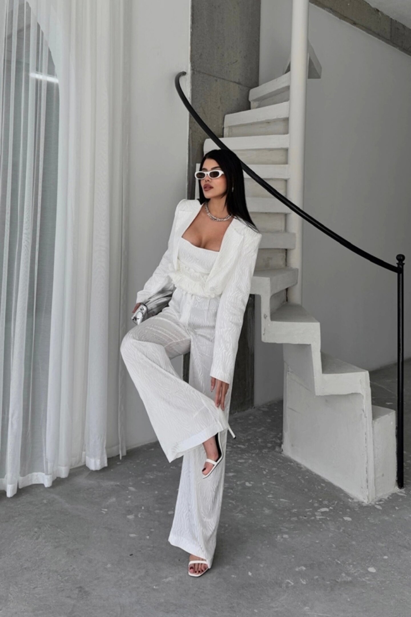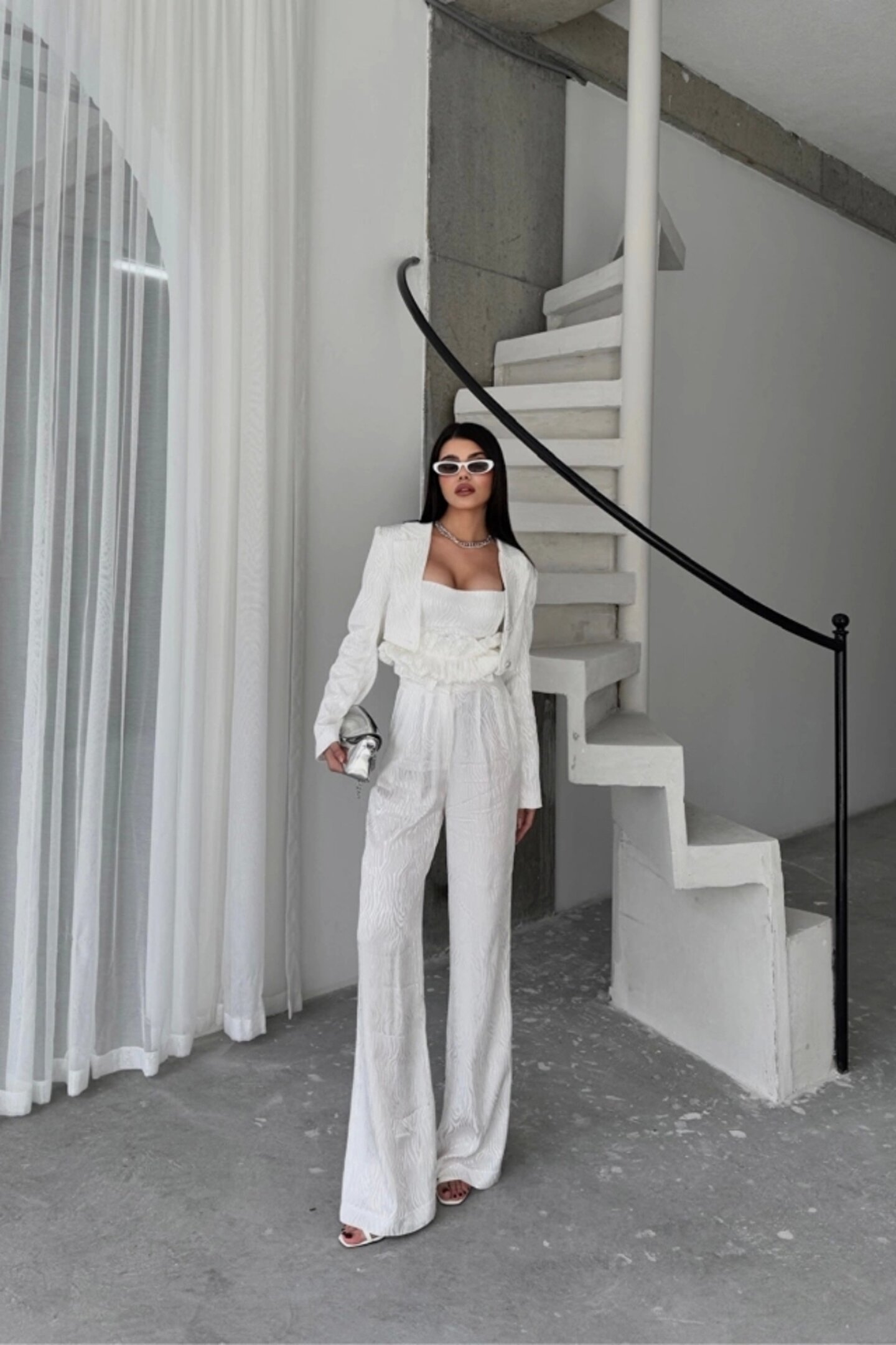 MODA JAKARLI BLUZU TASARIM DETAYLI CEKET-PANTOLON-BLUZ 3 LÜ TAKIM - Beyaz
