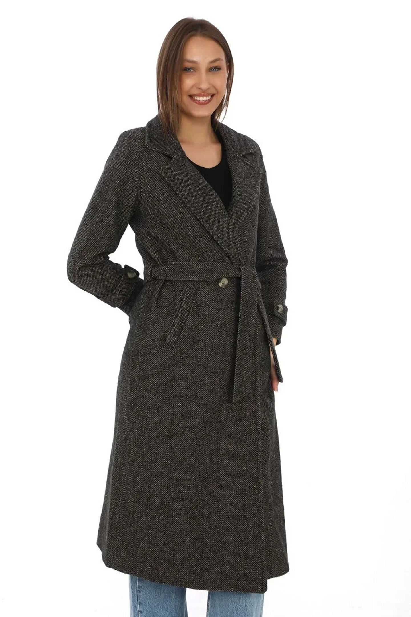 MODA Kadın Balık Sırtı Kaşe Kaban – Uzun Boy Kruvaze Yaka Kuşaklı Astarlı Kışlık Tesettür Kaban, Yünlü Do